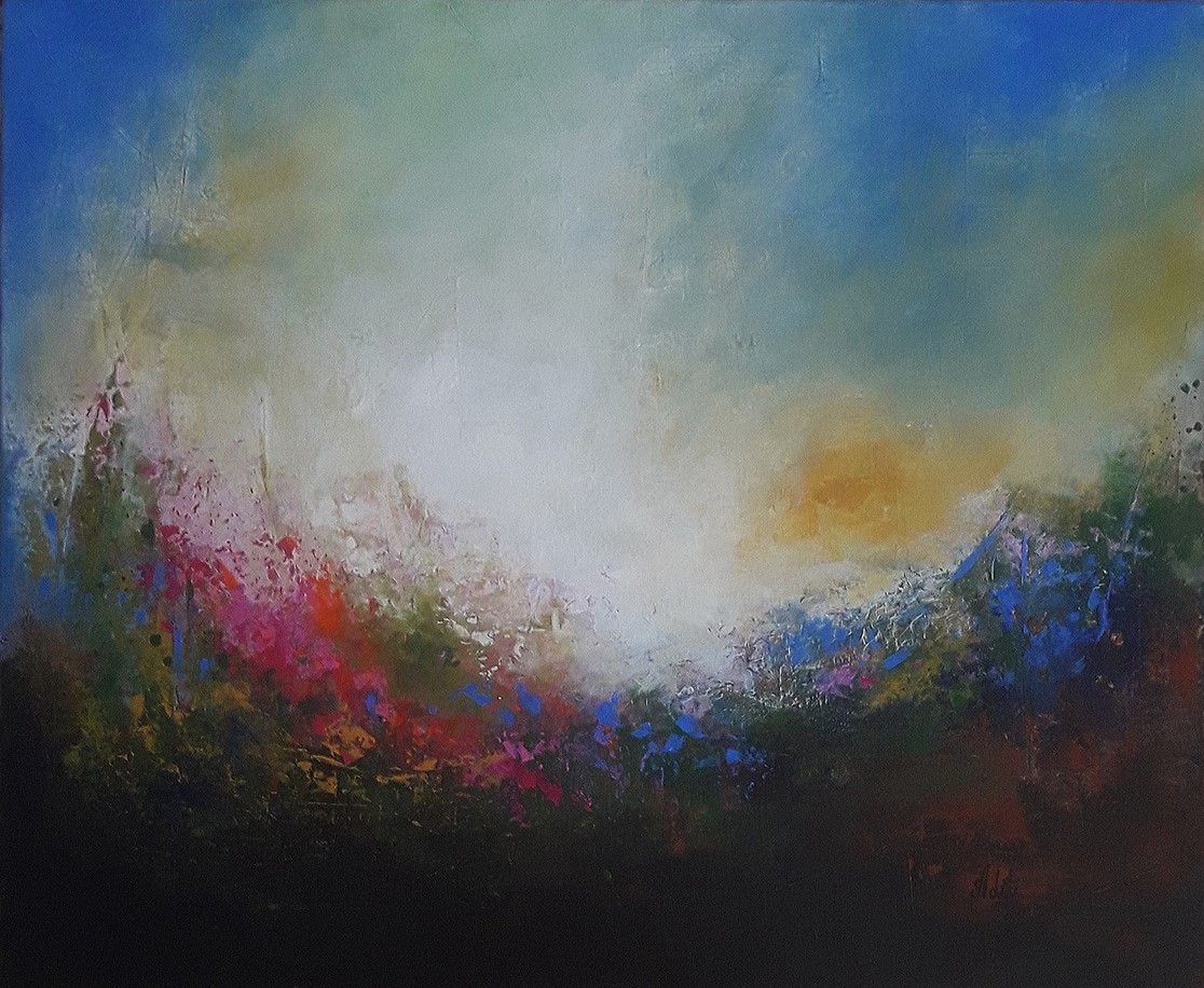 Painted from the memory of a visit to a mountaneous valley covered with grass and colorful wildflowers, this abstract landscape gives the perception of a dreamland. The line between the land and the sky blurs and seems like the melting of the real in the unreal. The impasto technique further enhances the abstraction with colours and thick textures.