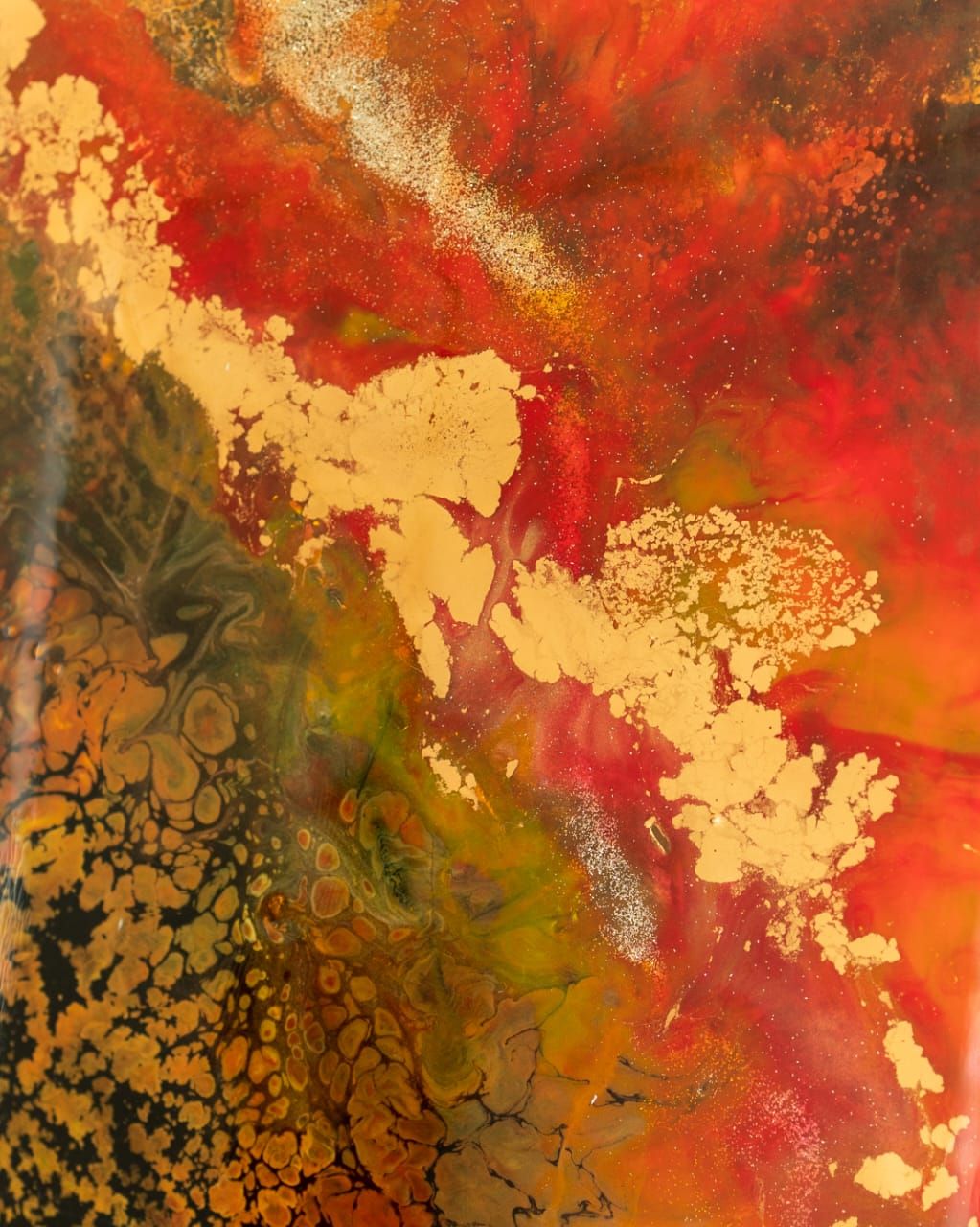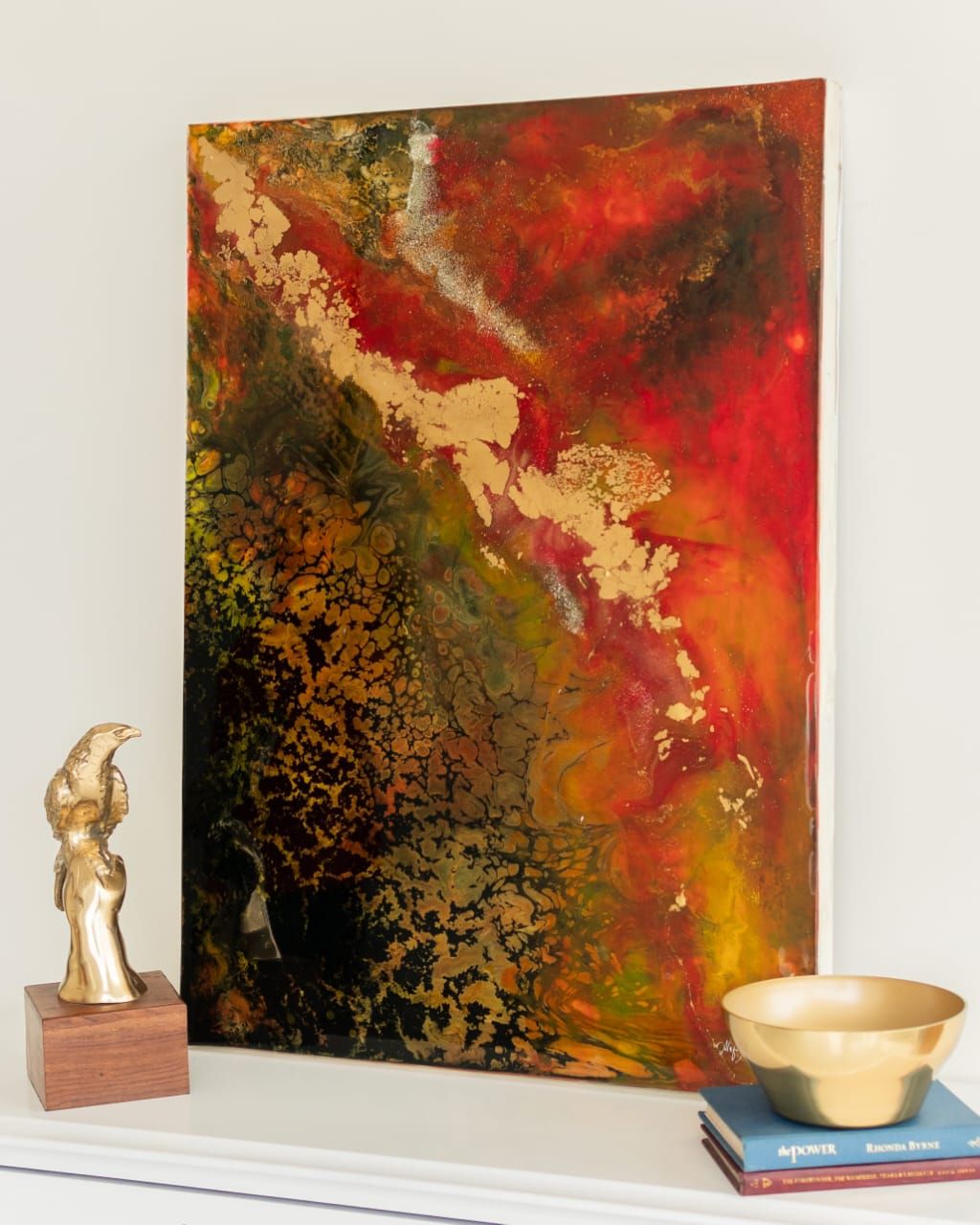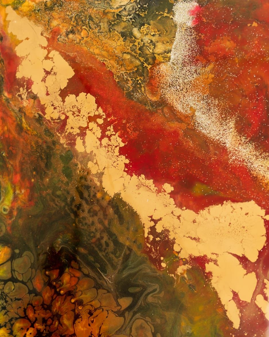 In Opulence, I let richness take the lead—through flowing reds, gilded textures, and luminous depth. The layers speak of warmth, abundance, and quiet confidence. With resin and mixed media, I’ve captured the feeling of something rare yet deeply familiar—like a memory wrapped in silk and sunlight.
