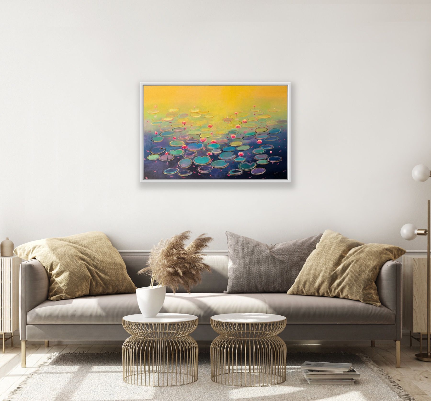 Golden Serenity captures the quiet magic of a sunrise settling over a lily pond. Soft golden light shimmers across the water, illuminating the delicates blooms in a peaceful glow.