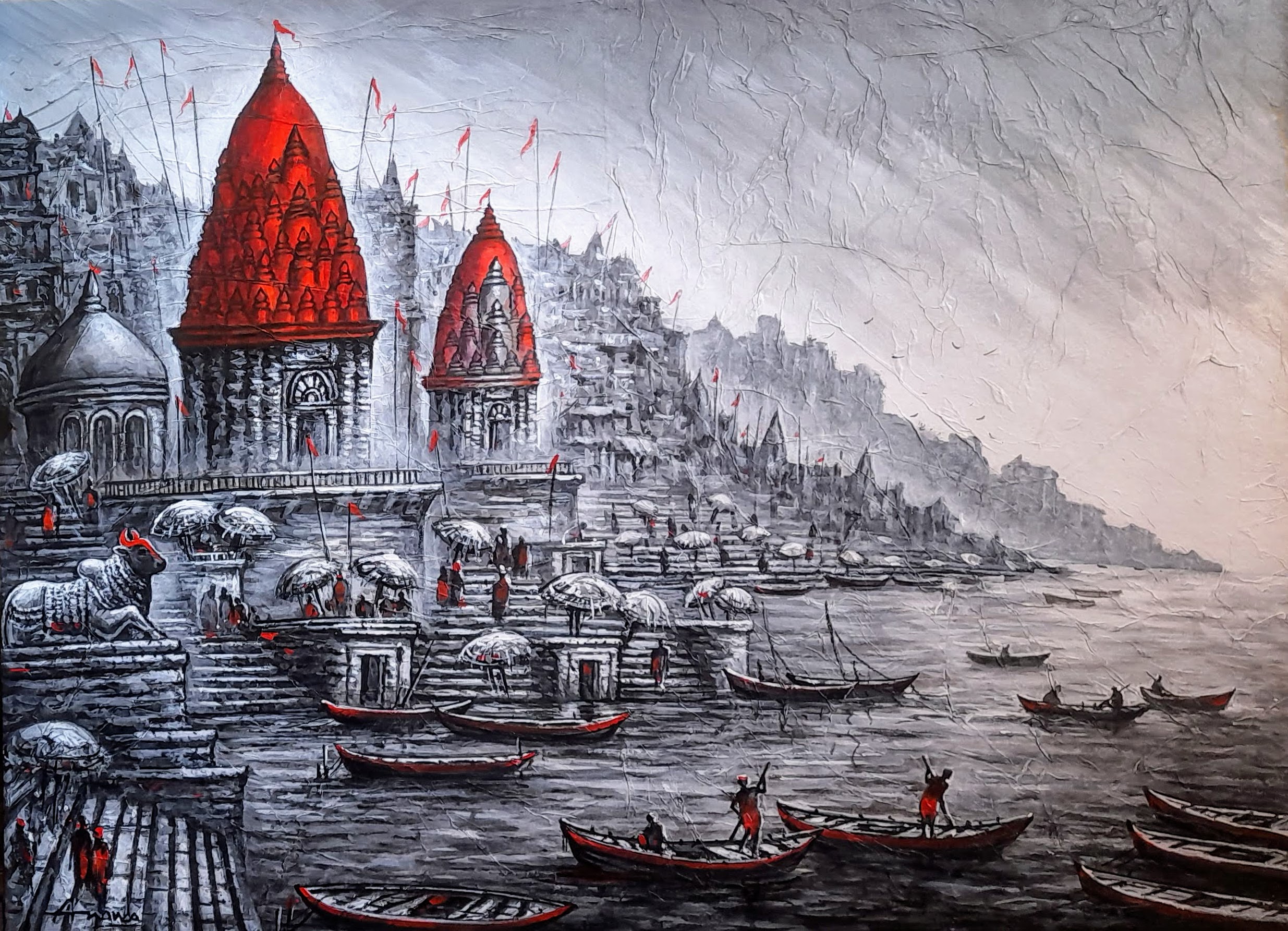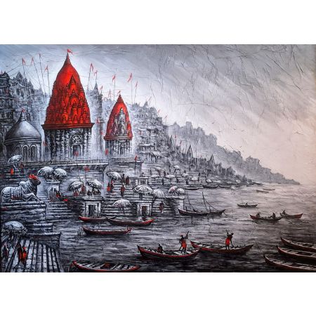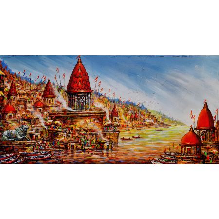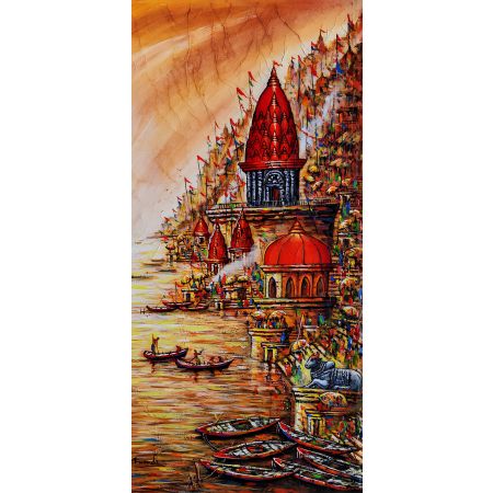 Close your eyes for a moment and imagine the sounds of Varanasi: the gentle lapping of the Ganges, the rhythmic chants of the priests, the distant ringing of temple bells. Open your eyes, and this painting will transport you there. Artist Ananda Das has masterfully woven together the vibrant tapestry of Kashi's spiritual landscape, depicting the iconic ghats, the majestic temples, and the profound devotion of its people. The Ganga Aarti, a sacred ritual of gratitude and reverence, is rendered with a luminosity that seems to emanate from the canvas itself.