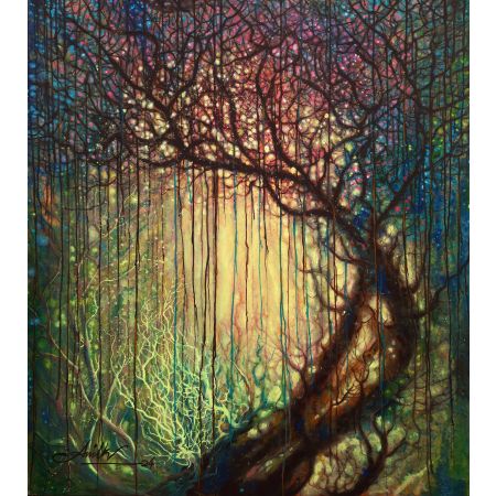 This painting represents the light within us—the enlightenment we find through spirituality and nature. The central glowing form, like a flame, symbolizes inner wisdom and guidance, inspiring us to live a good and healthy life.