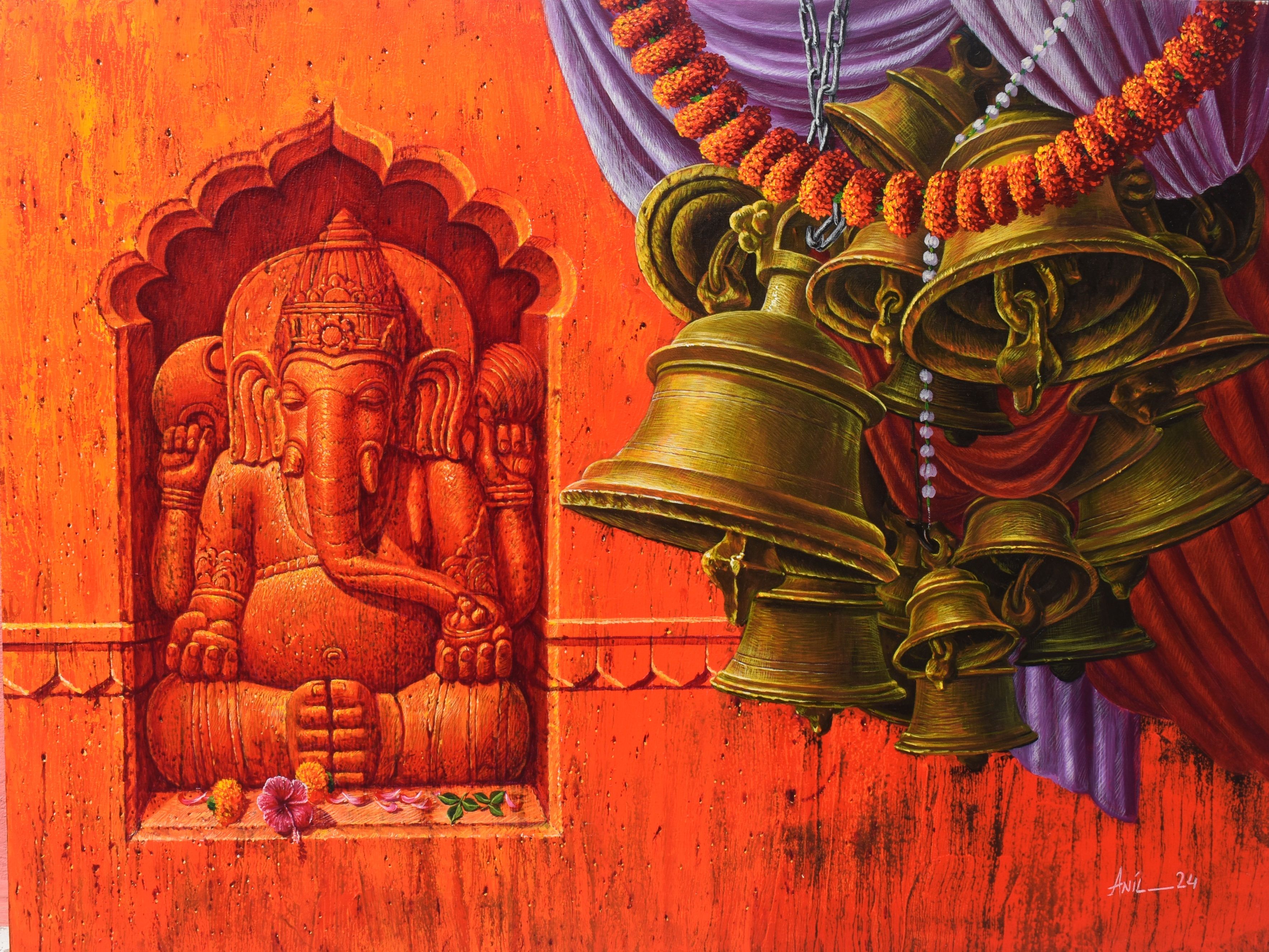 Anil Kumar Yadav, is an artist from Gorakhpur born in 1984, one of the holy cities of India. Anil has walked down the dingy lanes of Varanasi, sat by the ghats, lived and felt the homes there to literally feel the Banaras which is older than history. All those who have visited this divine place have found love and peace. Anil’s visual composition contains huge walls,temples ,bells and decorative doors that depict the unadulterated emotion surging in the landscape, leaving an overwhelmed feeling of finding something precious on the streets of Varanasi, at the doorsteps of its old houses. Anil paintings make you travel time, taking age one its toll, and can make you a shadow of your former self and get the sparkle back in your eyes. Anil’s visual narration presents a pulsating culture, depicting a deep-rooted interest and fascination for the spiritual intricacies of Hinduism. His colours build a sense of community making it welcoming.