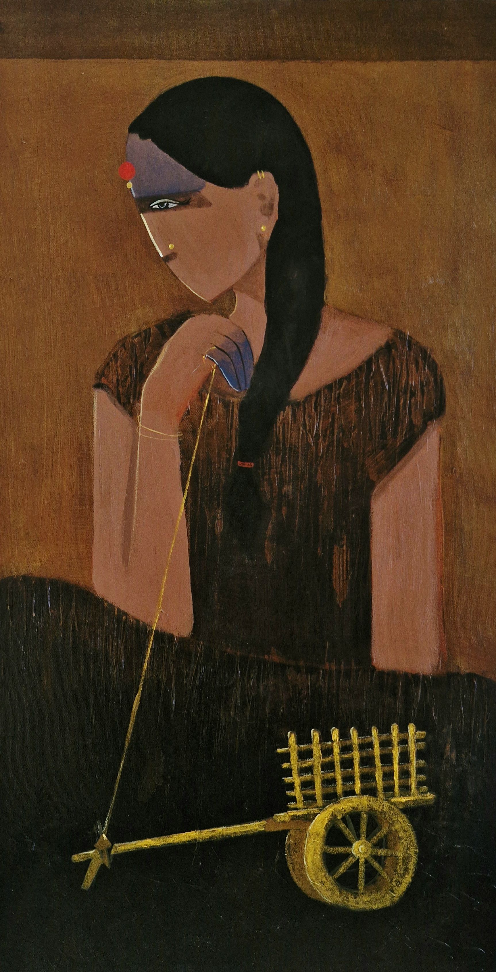 A striking symbolic element is the small cart placed near her, rendered in yellow. This cart represents labor, livelihood, and movement—an unspoken reminder of the everyday work and burdens carried by rural communities. The thin line connecting the girl to the cart subtly suggests that her life, thoughts, and identity are deeply tied to work and responsibility from an early age.