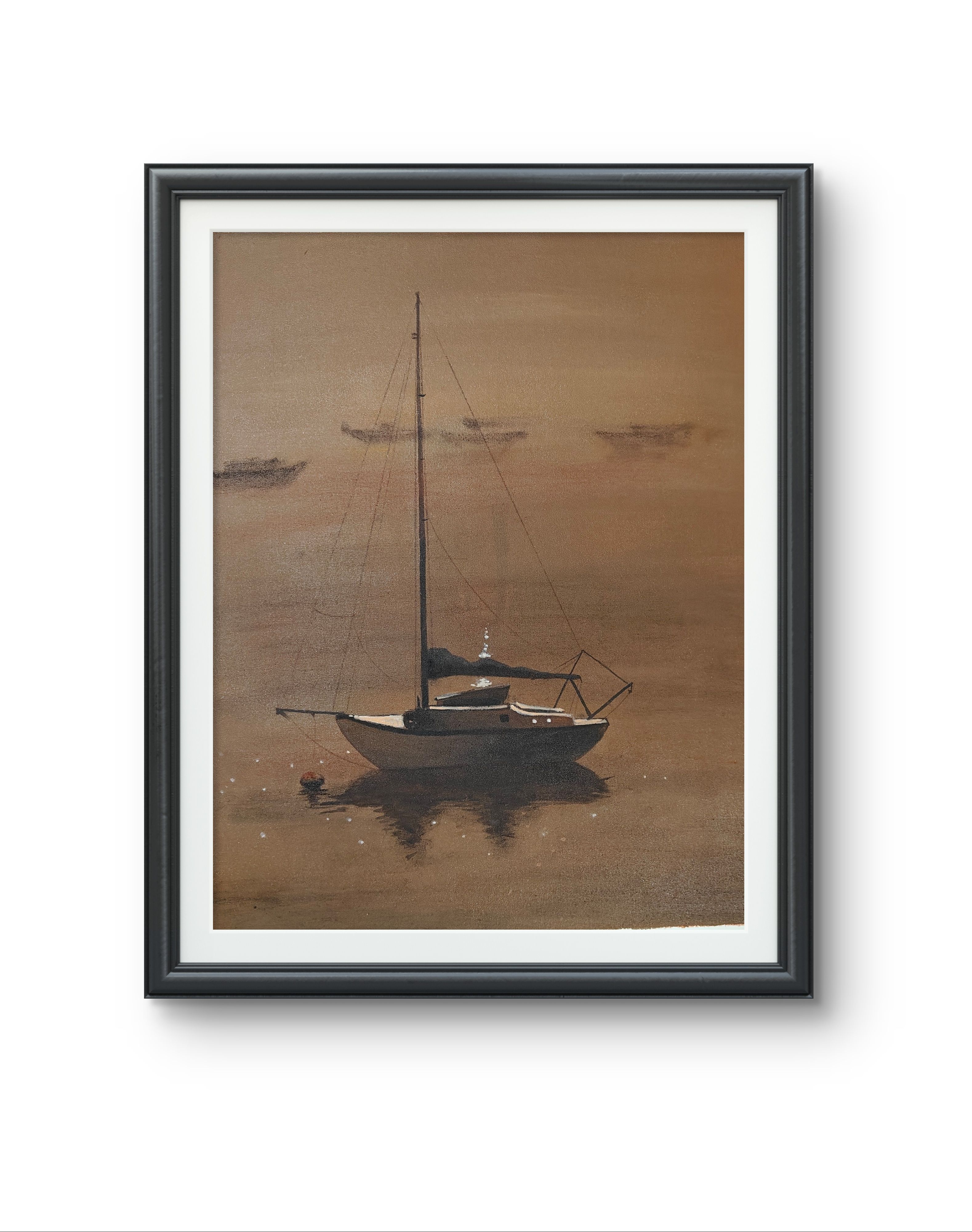 The painting of a solitary baot and its reflection gives a silence, resillence and introspection. Mixed media done on canvas using acrylic and soft pastel.