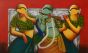 "The Eternal Flute" captures the divine harmony of Lord Krishna playing his flute, surrounded by two gopis enchanted by his music. The vivid red background contrasts with the serene green and gold tones, symbolizing devotion and love. A peacock, a timeless motif of beauty, completes this soulful, traditional composition.
