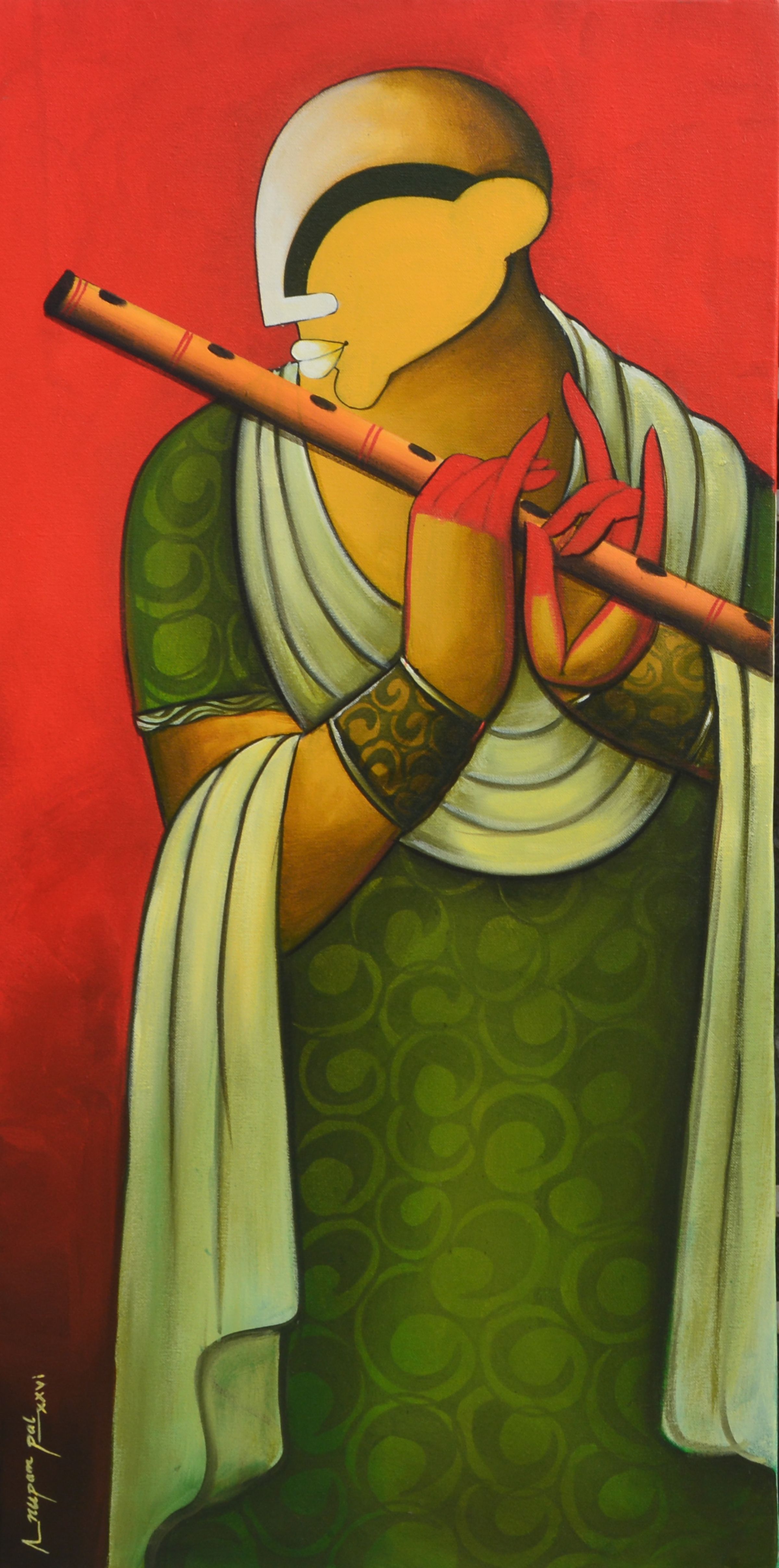 Echoes of the Flute captures a serene music-maker cloaked in warm tones. A figure with a stylized, faceless visage holds a bansuri against a vivid red backdrop, blending tradition and abstraction. Curved forms, green attire, and graceful hands suggest devotion, mystery, and timeless melody echoing through silent spaces of imagination.