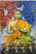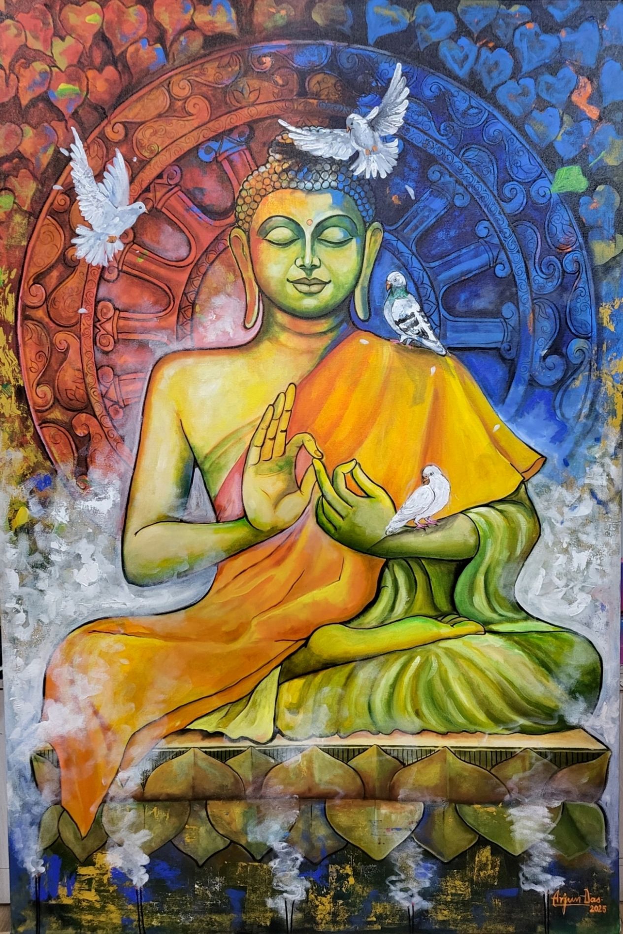A serene depiction of a meditative buddha is surrounded by white doves and vibrant colours, symbolizing peace and harmony.