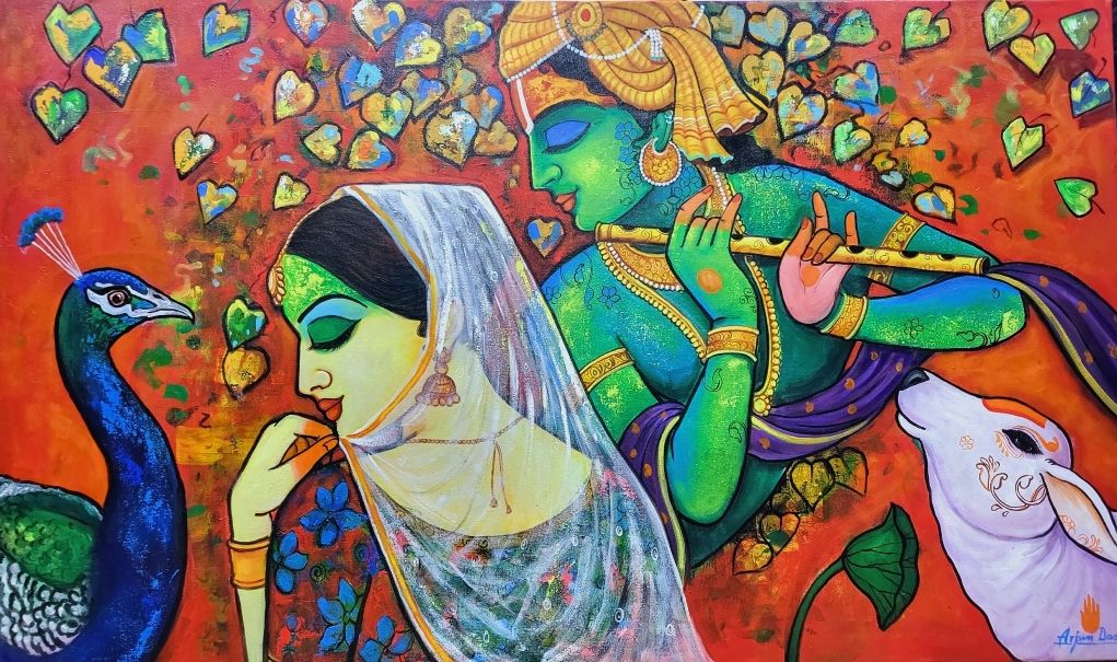 The painting depicts a veild radha standing next to a flute playing krishna, with a leafy background decorated with peacock and krishna's love cow, with bright, contrasting colours adding to the mystical ambiance.