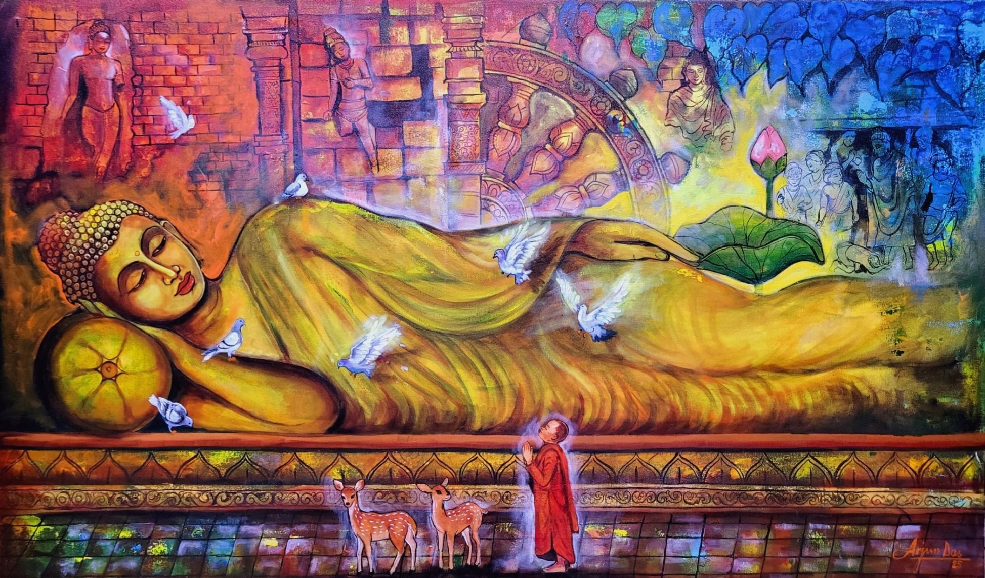 A Serene view of lord buddha in reclining position, and a masterpice of peace and light, it is a popular icongraphic depiction in buddhism, according to vaastu, placing a statue of buddha reclining on the right side and facing west brings peace and harmony in your home.