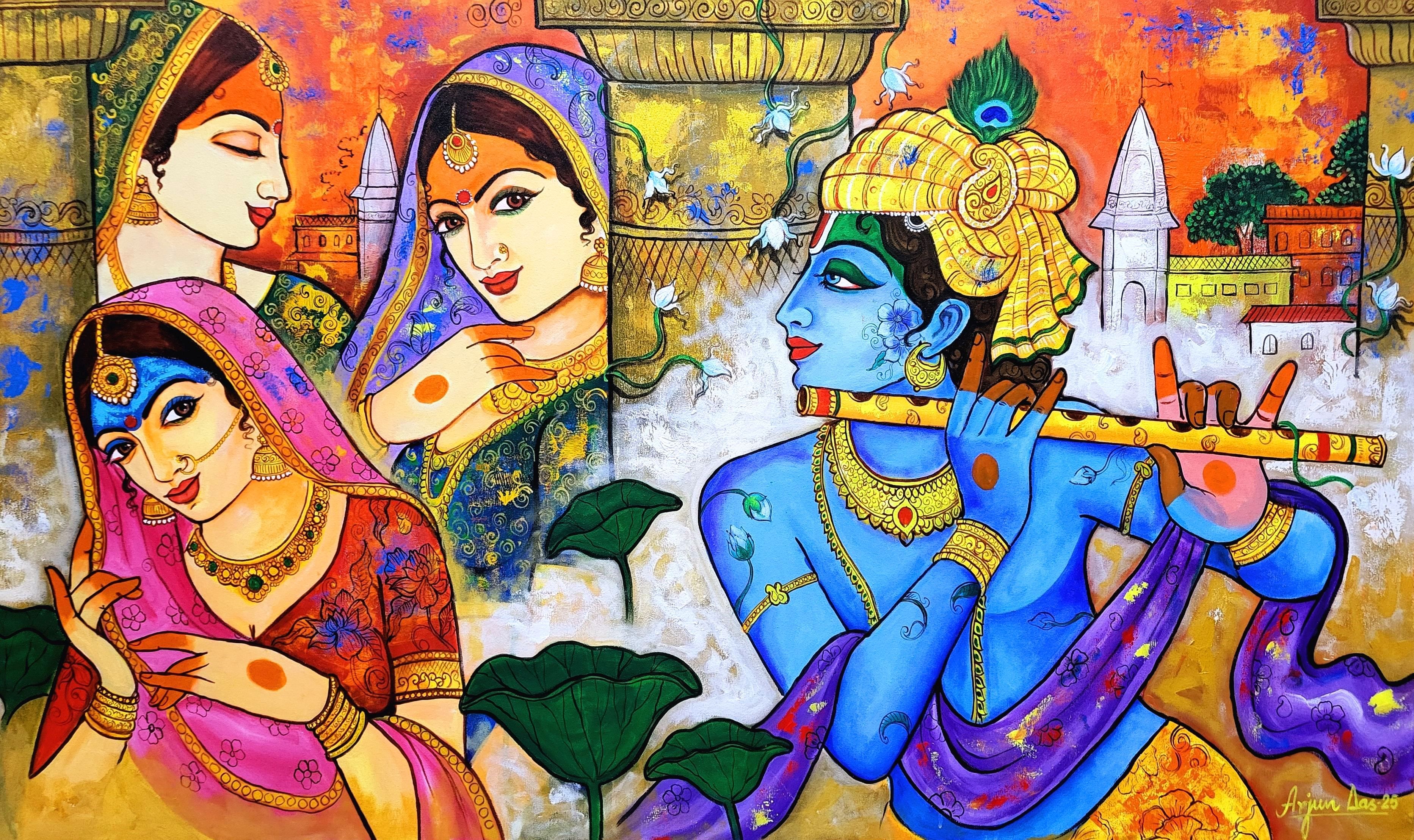 DIVINE MELODY'' a contemporary painting that captures a moment of pure enchantment, krishna with his golden flute, is depicted mesmerizing radha and two gopis, all adorned in sarees of vibrant pink and blue.