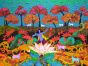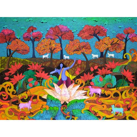 Krishna is in harmony with nature, cows, symbolizing a peaceful and balanced existence.