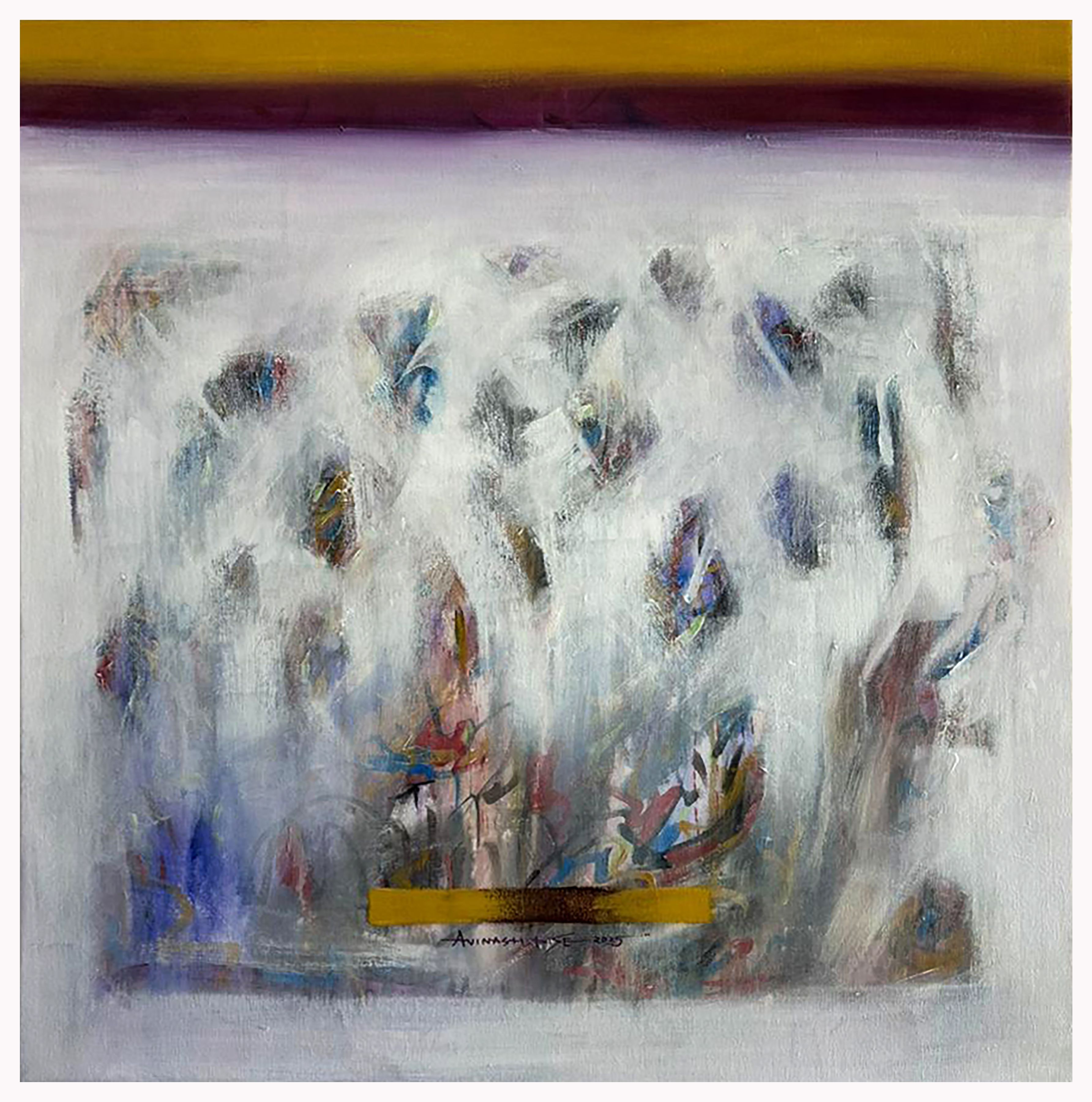 The clear, linear elements that often surface in my work symbolize unity, wholeness, and infinity. They arise naturally when I surrender to the process, allowing the tools to act as extensions of my body. Each stroke is a conscious embodiment of thought, feeling, and presence, requiring both discipline and surrender. This method transforms painting into a meditative yet dynamic journey of self-discovery.
