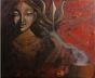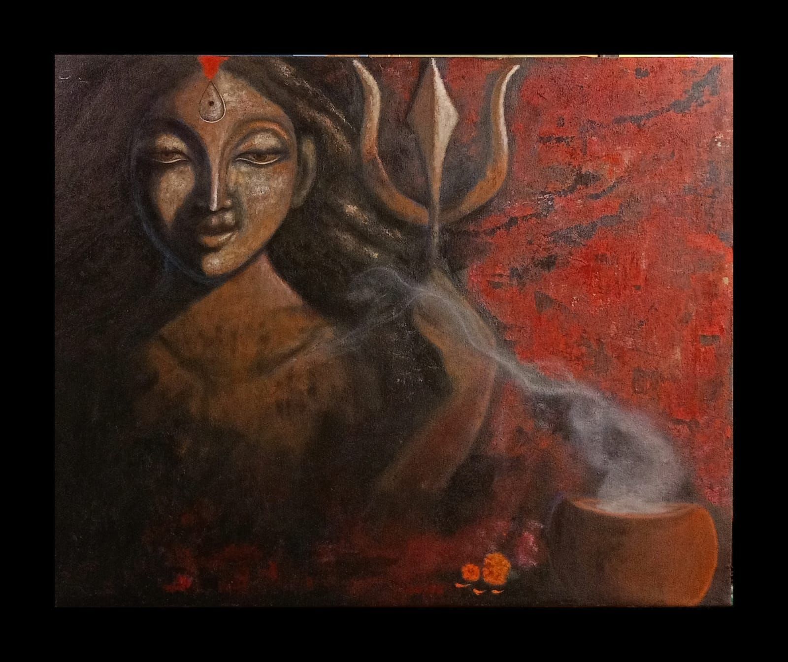 In this spiritual painting, I aim to portray the rise of spiritualism (light) by dispelling the shadows (obstacles). Imagining Goddess Durga emerging from an ancient mine cave, where an unfinished stone-carved idol is still revered, captures her timeless feminine power. The background, rich with darkness and vibrant hues of red, orange, crimson, and a touch of gold, enhances the divine aura of the goddess.