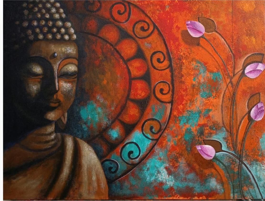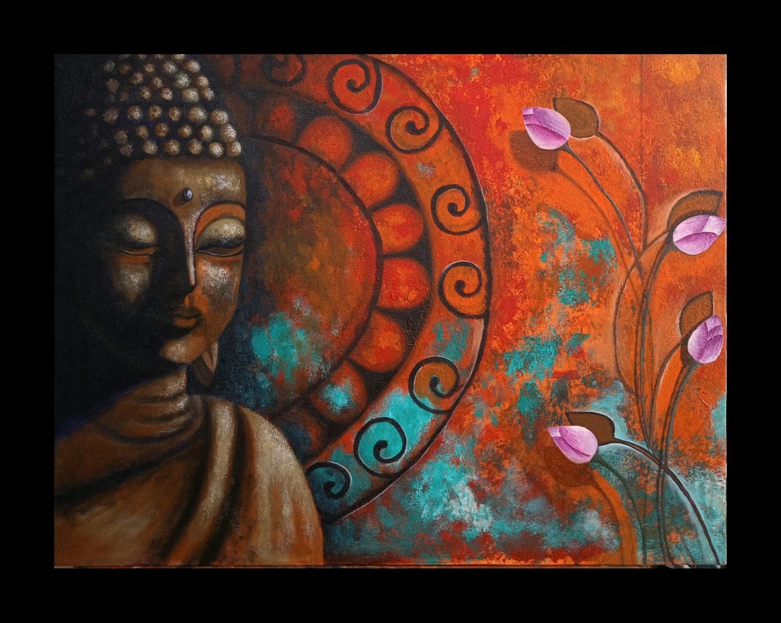 The glowing, aged metal Buddha stands as a testament to resilience and wisdom, while the lotus symbolizes purity and growth. The vibrant hues of orange and turquoise in the background embody energy and tranquility, enhancing the essence of inner peace.