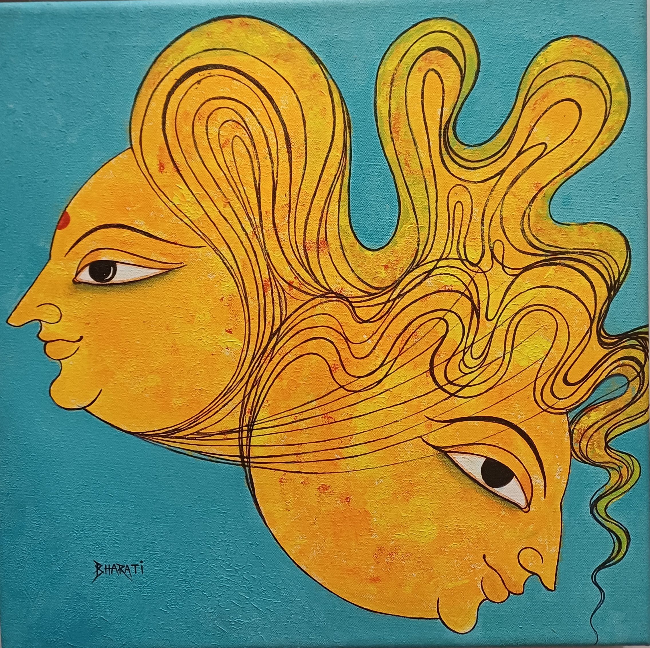 Here I tried to depic the silent conversations between two persons. Also the colors I used are vibrant and calming at the same time. The eyes are expressive and both the faces are intertwined together
