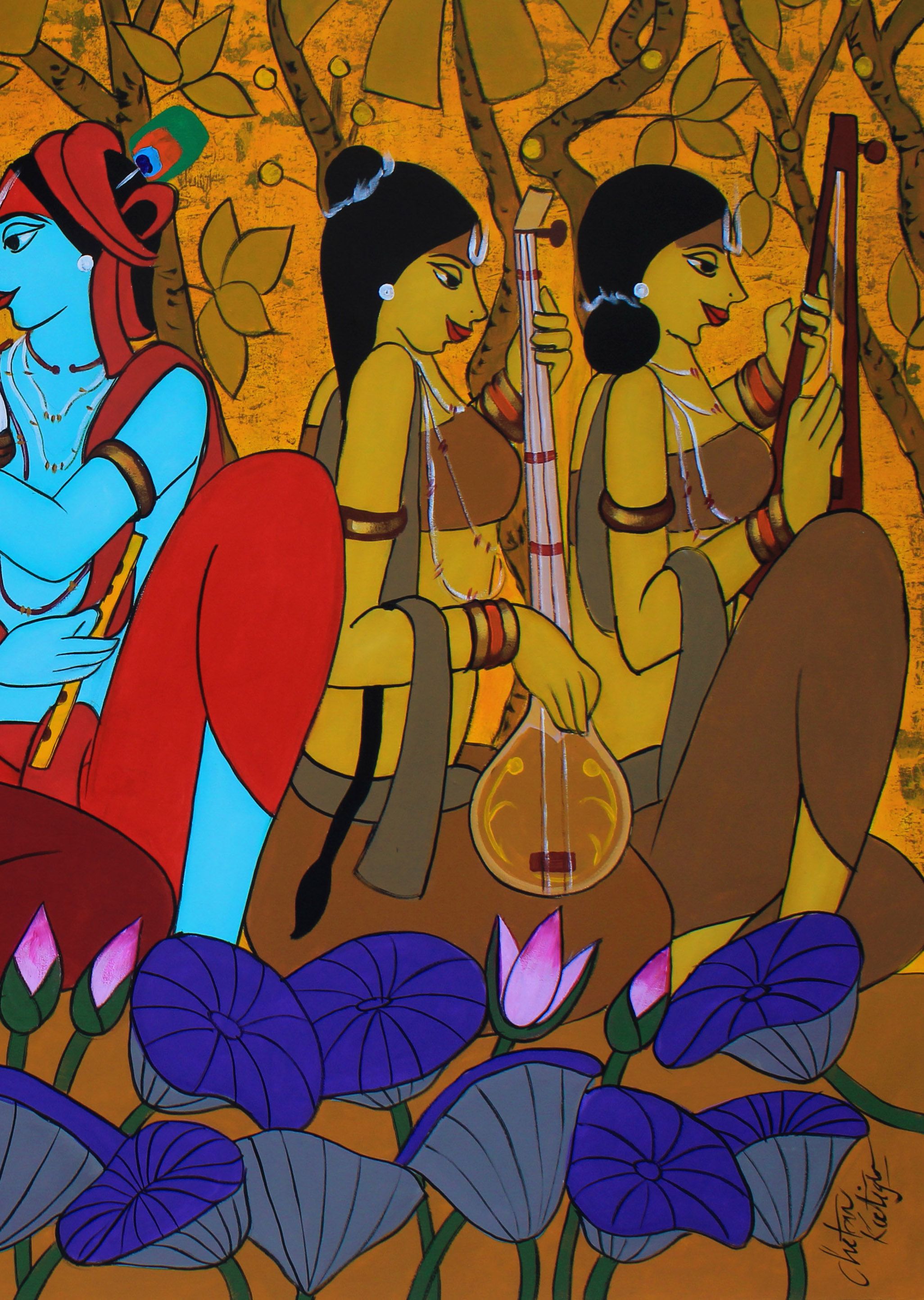 Inspired by the early love story of Radha and Krishna, this artwork captures the transcendence evoked by Krishna’s divine flute, said to draw all beings into a state of blissful samadhi. The composition reflects serenity, devotion, and the timeless harmony of their bond.