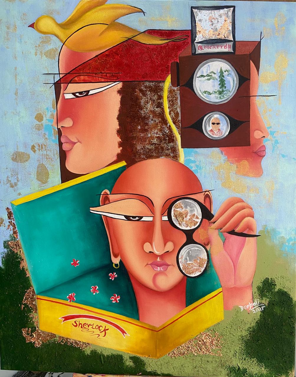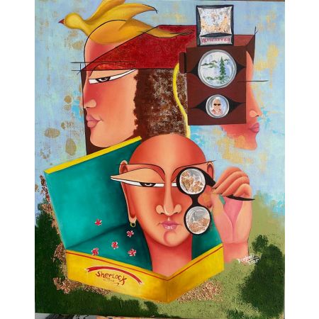 This painting embodies the “Out of the Box” theme both literally and conceptually. The central figure emerges from a box labeled “Sherlock,” symbolizing curiosity, critical thinking, and the pursuit of hidden truths. The fragmented faces, surreal elements, and investigative motifs challenge conventional perspectives, encouraging viewers to look beyond the obvious. The mix of abstract forms and realism pushes creative boundaries, reinforcing the idea of thinking differently and exploring beyond limitations.