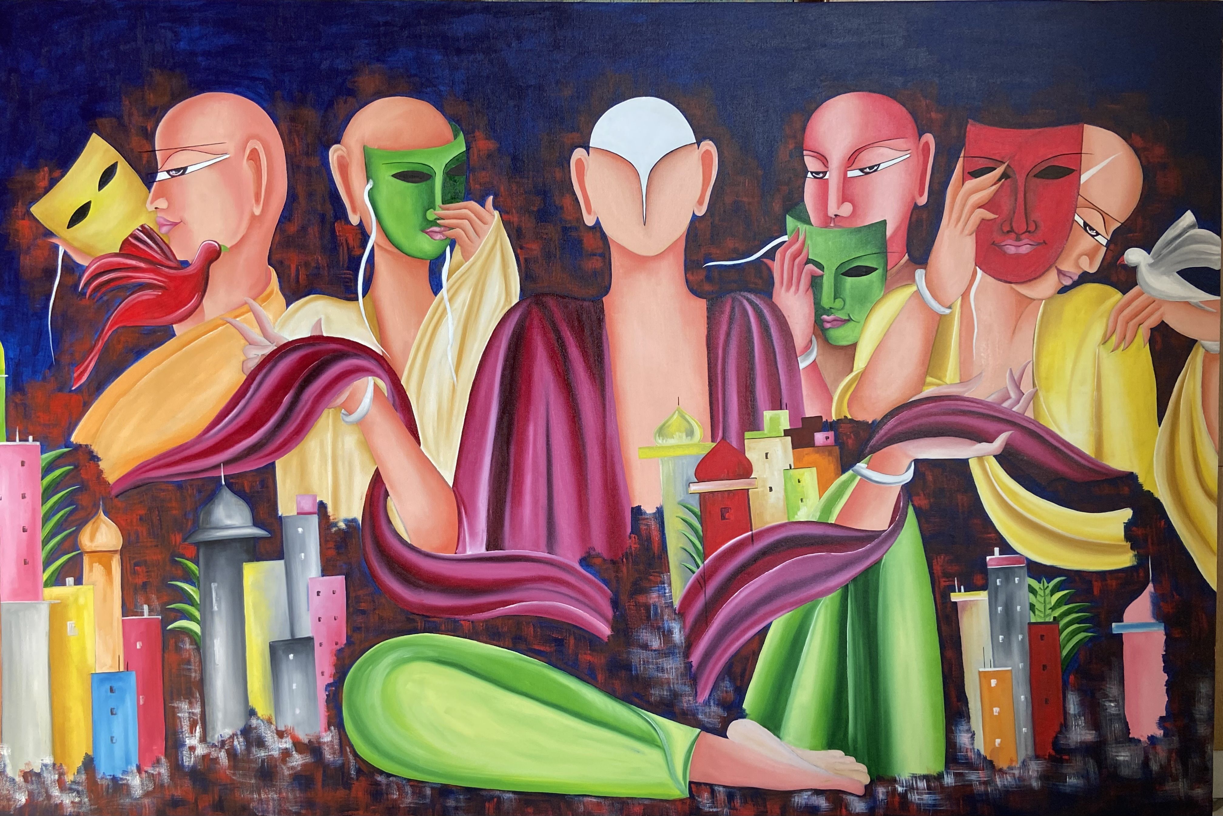 The man in the centre with ivory head is representative of a man who has found peace; who has become an enlightened being. But in the past he has donned multiple masks. In this era, everyone wears many faces that they show differently to different people, so has this man. But when the masks come off, and the man finds peace— that is only when he is with his truest self, a soulful blissful being.