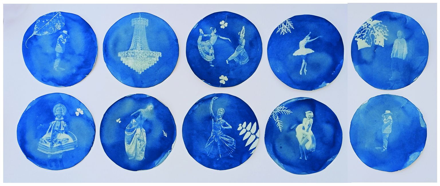 These set of 10 handprint cyanotypes are size 7 x 7 inches diameter each. These works are inspired from the grace of the Indian dance forms and western through the metaphoric refrences.