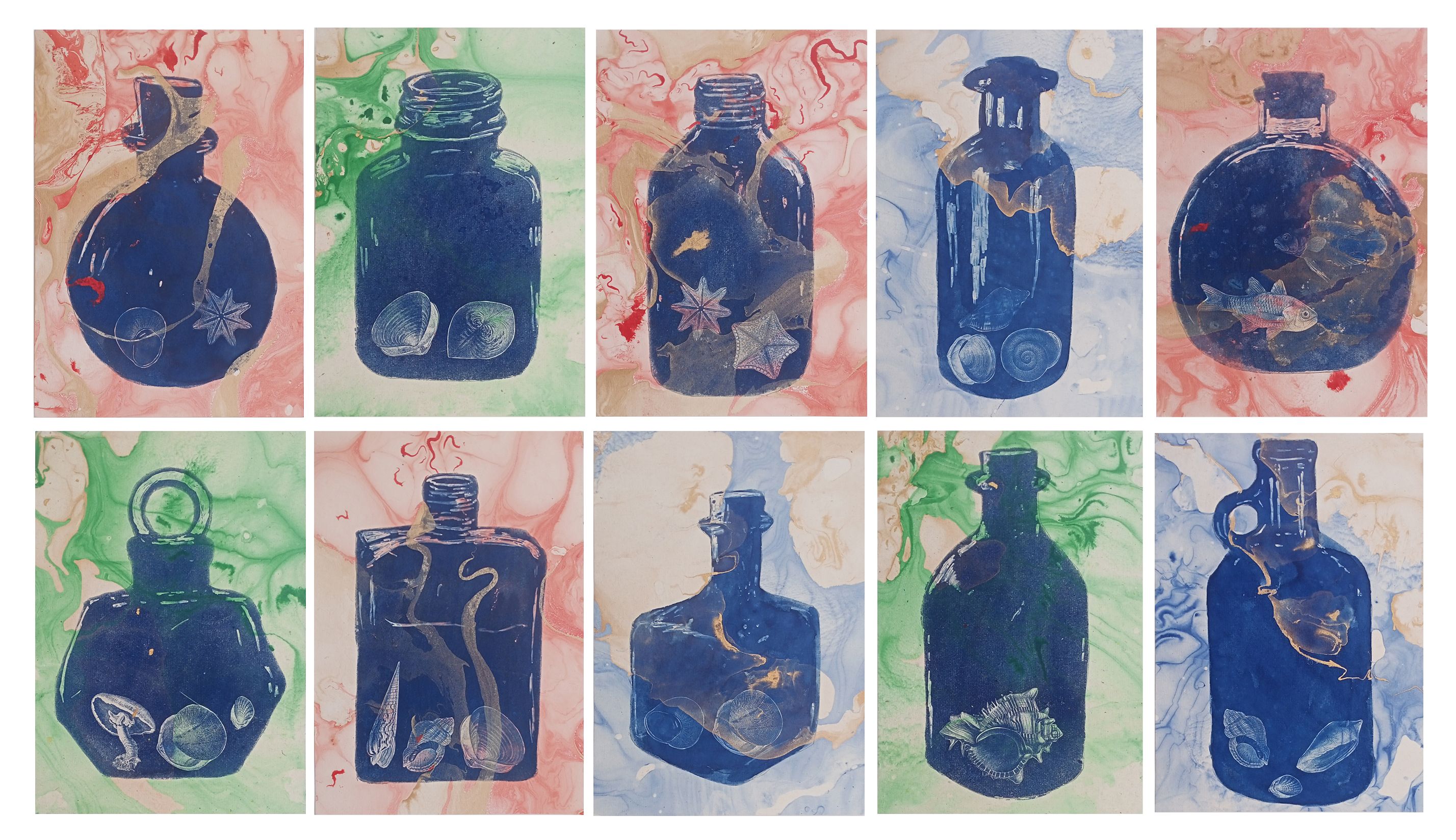 These set of 10 Cyanotypes on marbled handmade paper, 11 x 8.5 inches each are the new series of works has become a land where imagination, longing and experience meet. I observe various sea shells from surrounding nature. Started creating collages full of allegories from negatives and sea shells I found.