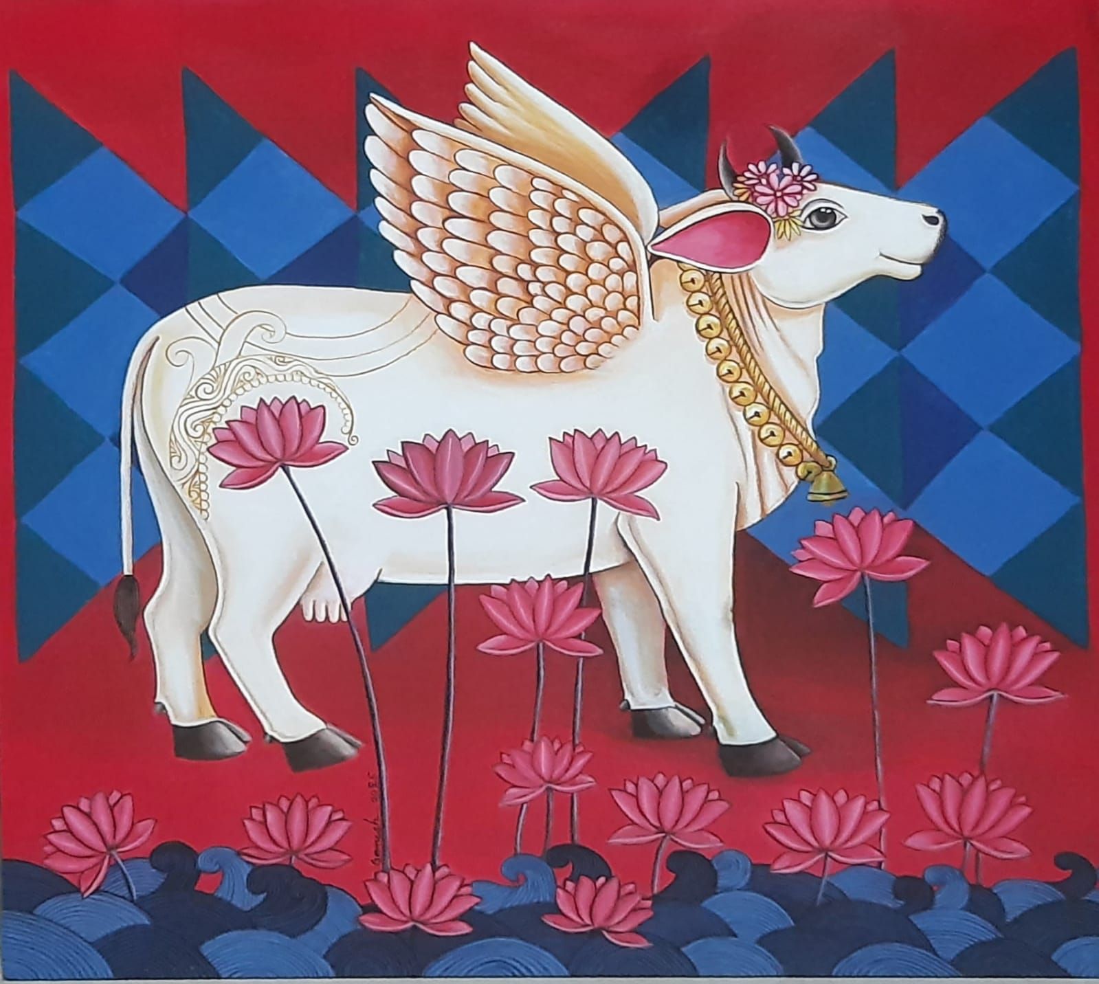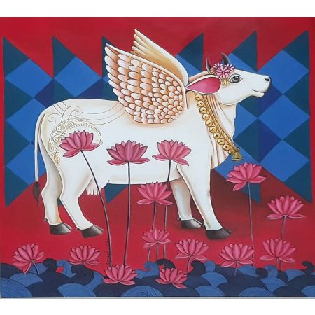 “My painting is based on the Kamdhenu series, a celestial being from the Hindu mythology which was brought to earth during the churning of the oceans. This popular, auspicious, and beloved cow is believed to grant everything that one can think of. The representation of her is synonymous to my style of work with the bunch of flowers adorned lovingly on her head. Sprightly flowers glisten like precious stones and suggest an apparent trance of enlightenment.” -- G. Ganesha Chary