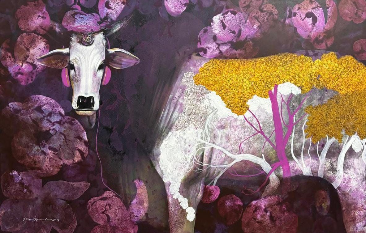 This captivating painting blends surrealism and symbolism to create a striking visual narrative. A white cow, wearing bright pink headphones, stands out against a deep purple background filled with abstract floral patterns. The cow's body features intricate details, including yellow foliage and white, vein-like roots that suggest a deep connection to nature. The use of vibrant colors like magenta, gold, and white adds an ethereal quality to the composition. This artwork seems to explore themes of modernity merging with tradition, and the harmony between humans, animals, and the environment. It invites viewers to reflect on coexistence and the spiritual bond with nature.