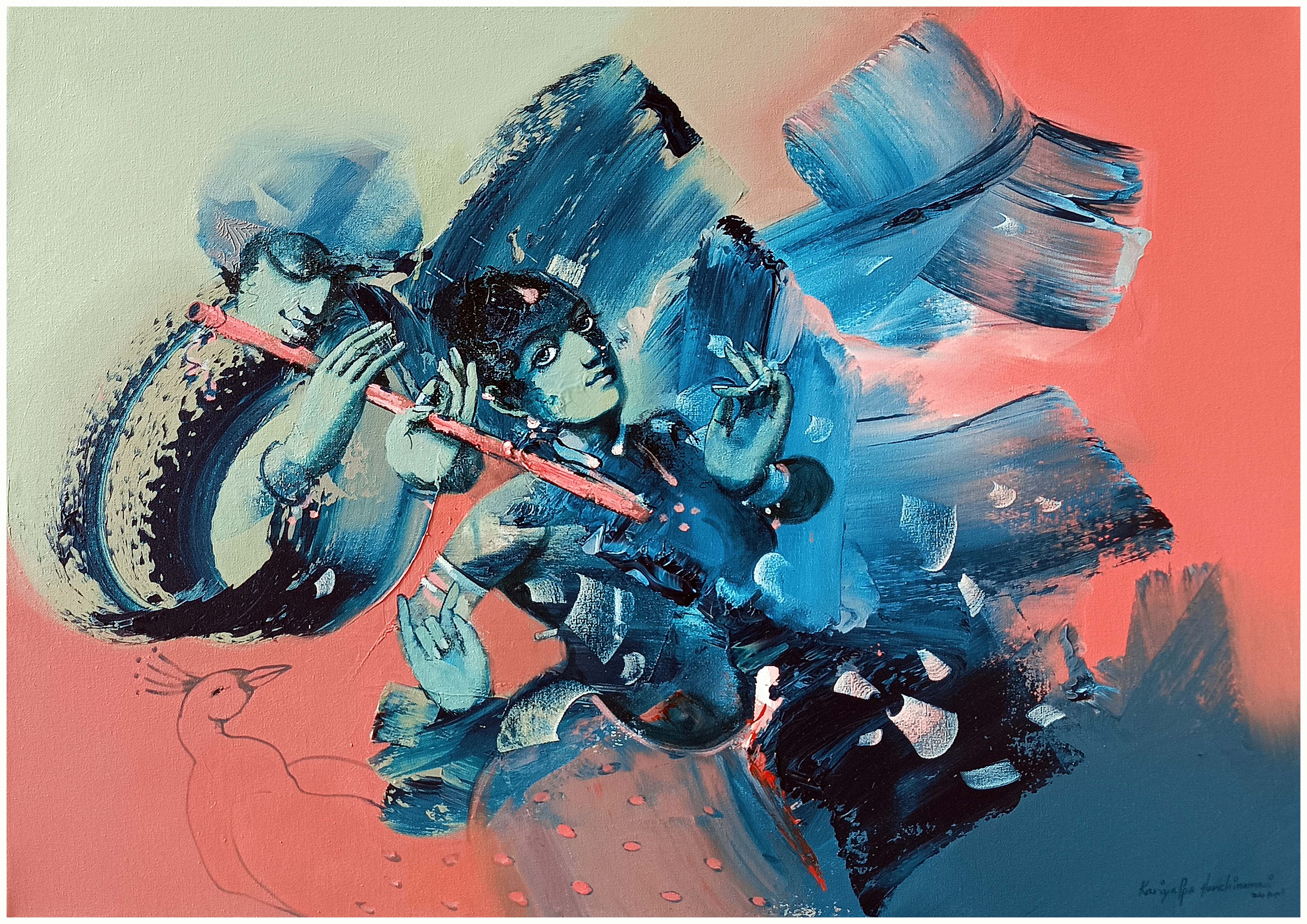 This is a Radha and Krishna, we sow in the painting like a folk dancer, i reflected in my artwork through vibrant colors in semi Abstract style