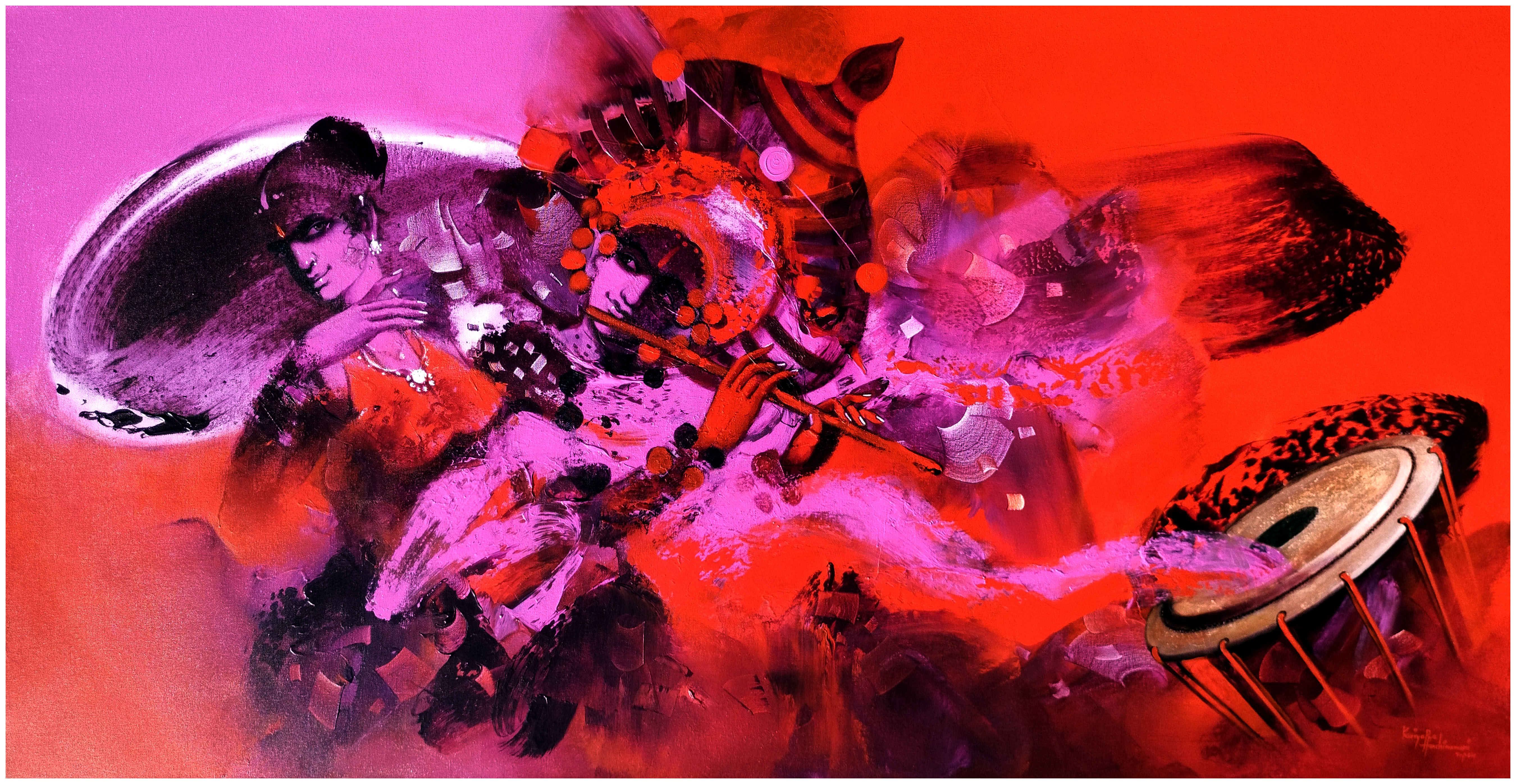 This is Radha & Krishna in the Yakshagana Folk Dance, we sow in the painting a folk dancer with a drum, i reflected in my artwork through vibrant colors in semi Abstract style