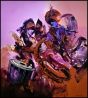 The artwork is dominated by shades of pink, purple and orange, creating a warm and energetic atmosphere. The style is quite expressive, with visible and dynamic brushstrokes that give the scene a sense of movement and fluidity. The edges of the figures and their clothes blend into the background, contributing to this sense of movement.
