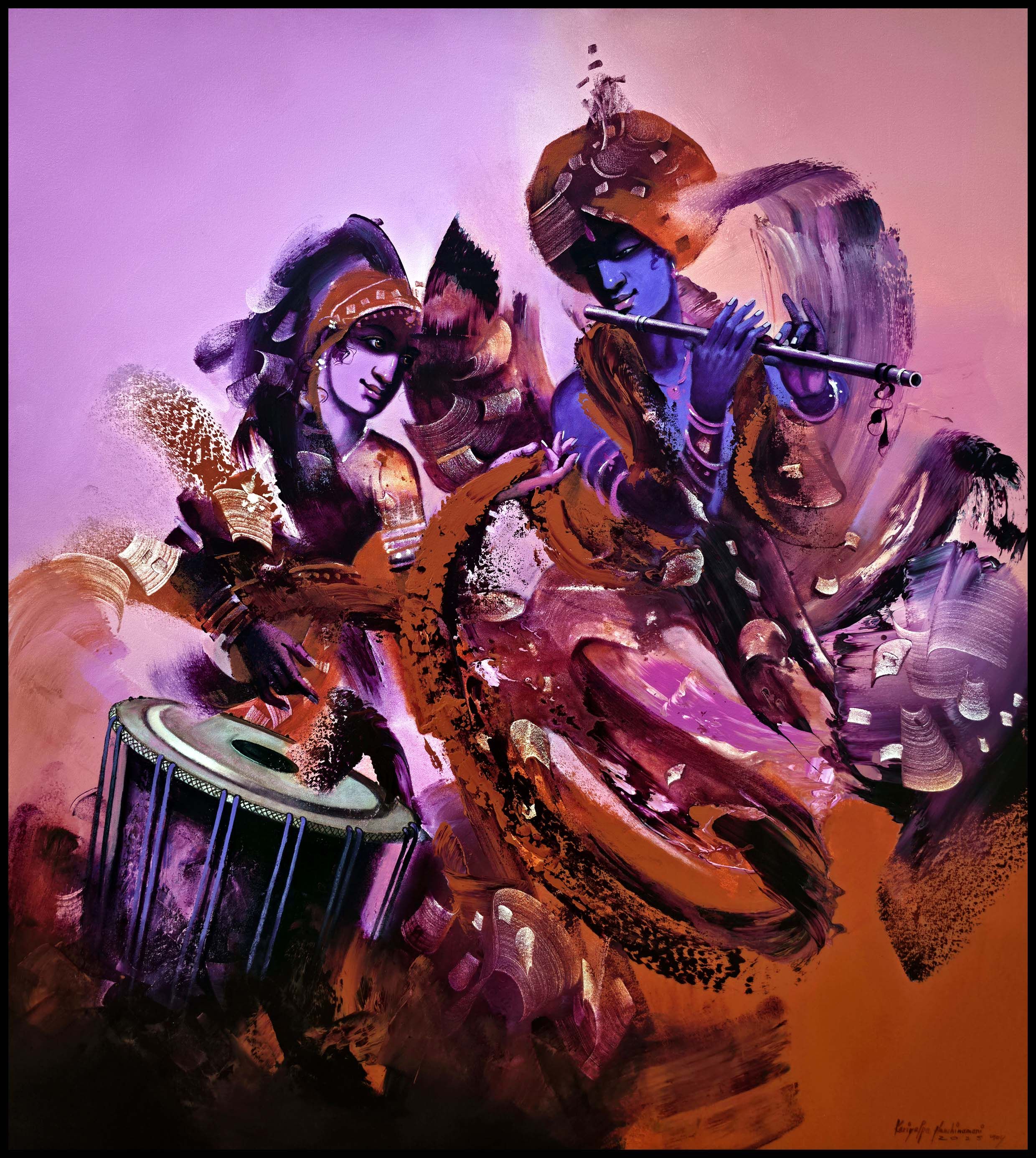 This is a vibrant and expressive painting, depicting a scene of the Hindu deities Radha and Krishna engaged in music and dance.
