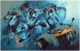 The artist employs a captivating palette dominated by various shades of blue and teal, conveying a sense of cool elegance and fluidity. Strategic accents of golden ochre and shimmering lighter tones are skillfully integrated, highlighting elements like the drum, jewelry, and the movement of the dancers' attire. These warm highlights create a striking contrast against the cooler blues, adding depth and visual interest.