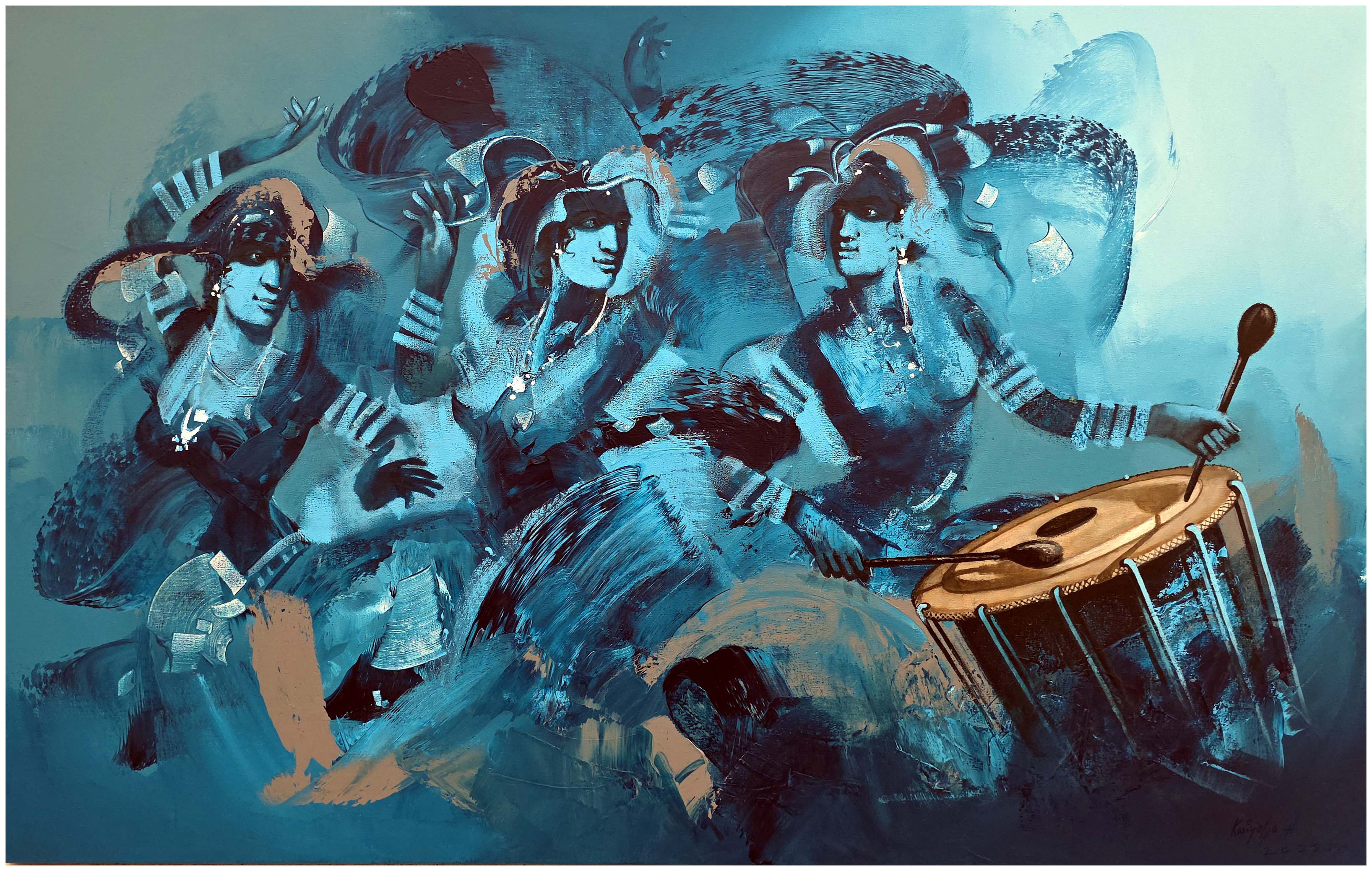 This grand acrylic on canvas, titled "Dancing," is a large-format artwork measuring 42x66 inches, created in 2025The painting dynamically captures the essence of a traditional Indian dance performance, featuring three figures in motion, accompanied by a drum.