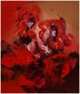 This dynamic 36x42" acrylic on canvas, "Dancing" (2025) explodes with passionate energy. Dominated by a rich spectrum of reds, from deep crimson to fiery orange, the painting depicts two figures in vibrant motion. Expressive brushstrokes and abstract forms convey the fluidity and joy of dance, with subtle hints of purple and lighter tones adding depth. The artwork pulses with an evocative rhythm, capturing the essence of movement and celebratory spirit.