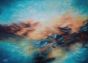 This painting depicts a vibrant abstract scene with swirling colors that evoke movement and energy. The predominant hues are blues, oranges, and yellows, creating a contrast between cool and warm tones. The colors blend and blur into each other, giving the impression of natural elements like sky, fire, or water merging together. The dynamic brushstrokes and soft blending of the colors suggest a sense of flow, possibly resembling a sunset over water or a dramatic seascape. The overall mood is serene yet powerful, with the interplay of light and color drawing the eye across the canvas.