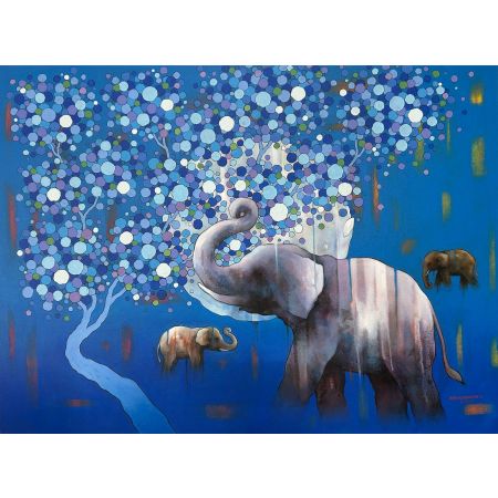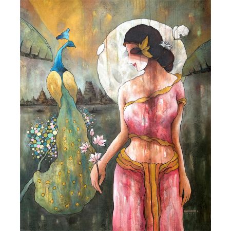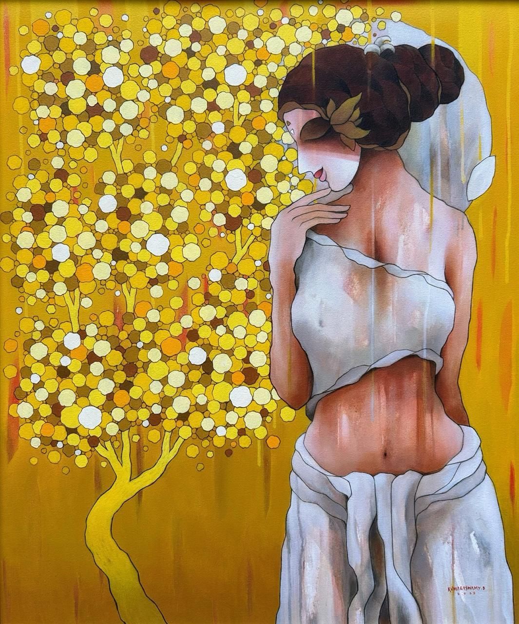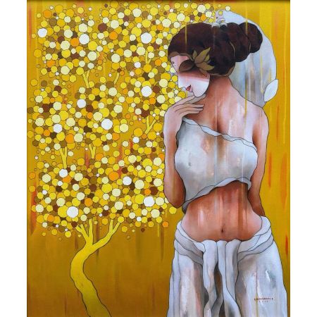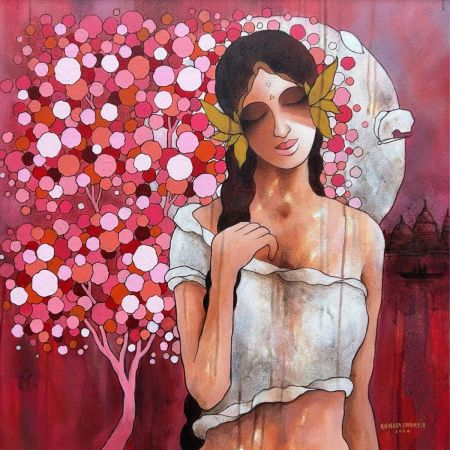 Kumaraswamy B's 'Women and Nature' painting beautifully captures the intimate relationship between woman and the natural world. With vibrant colors and flowing lines, the artwork portrays women in harmony with elements of nature, symbolizing themes of fertility, strength, and interconnectedness. The piece highlights the artist's deep appreciation for both feminine grace and the earth's nurturing power.