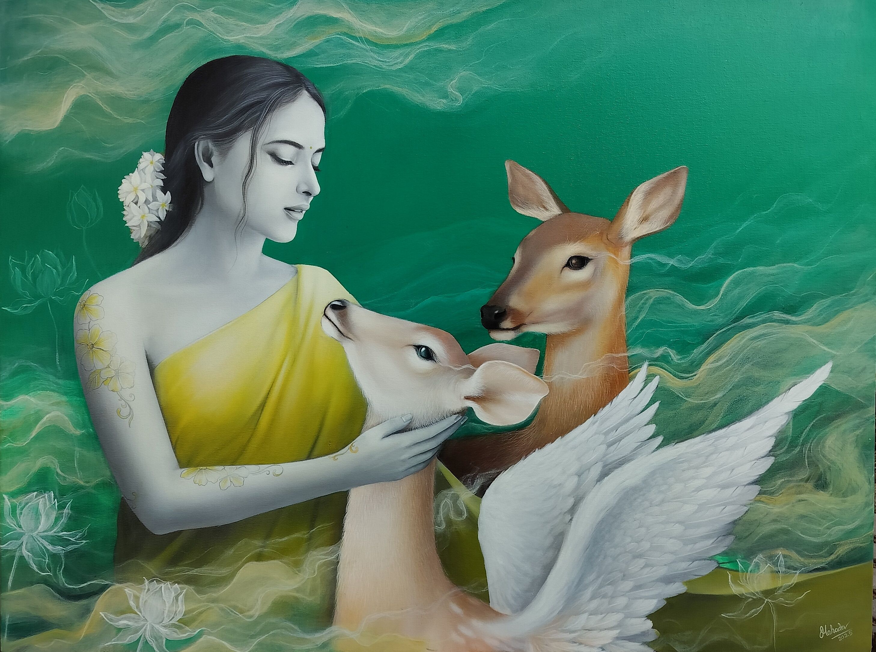 This is a painting from the *Prem Series*, in which a woman is gently caressing a deer. The deer’s wings represent the happiness hidden within love—something that is not seen, but felt. This painting depicts two worlds—one is **Realism**, which is visible to the eyes, and the other is **Surrealism**, which resides in the mind and emotions. The *black and white* wings of the woman and the deer signify that love is made up of all colors, just like sunlight.
