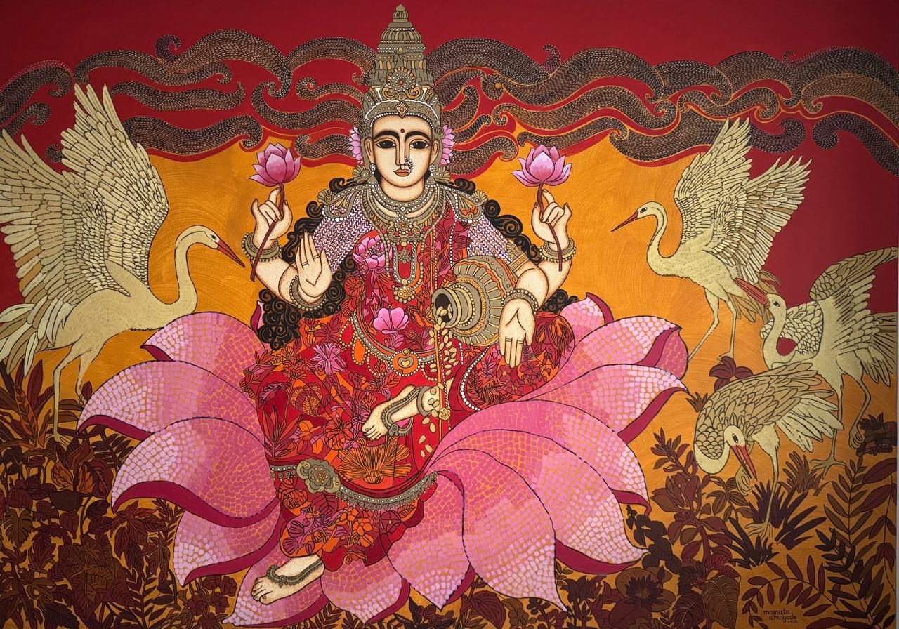 It is a painting of Maa Lakshmi, the Hindu goddess of wealth, prosperity, and good fortune. She stands or sits on a fully bloomed pink lotus, symbol of purity rising from the mud. Her skin is golden, glowing like freshly polished brass. She has a gentle, calm smile — eyes slightly lowered in compassion.