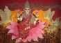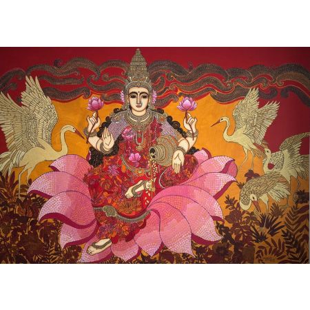 She is usually shown with four arms. Two hands hold lotus flowers, signifying spiritual and material growth. One hand is raised in the abhaya mudra, blessing and assuring protection. The fourth hand tilts down, pouring a stream of gold coins, showing that she grants wealth.