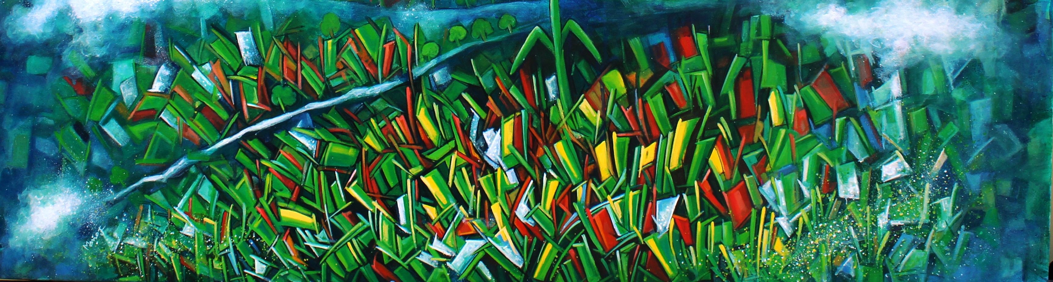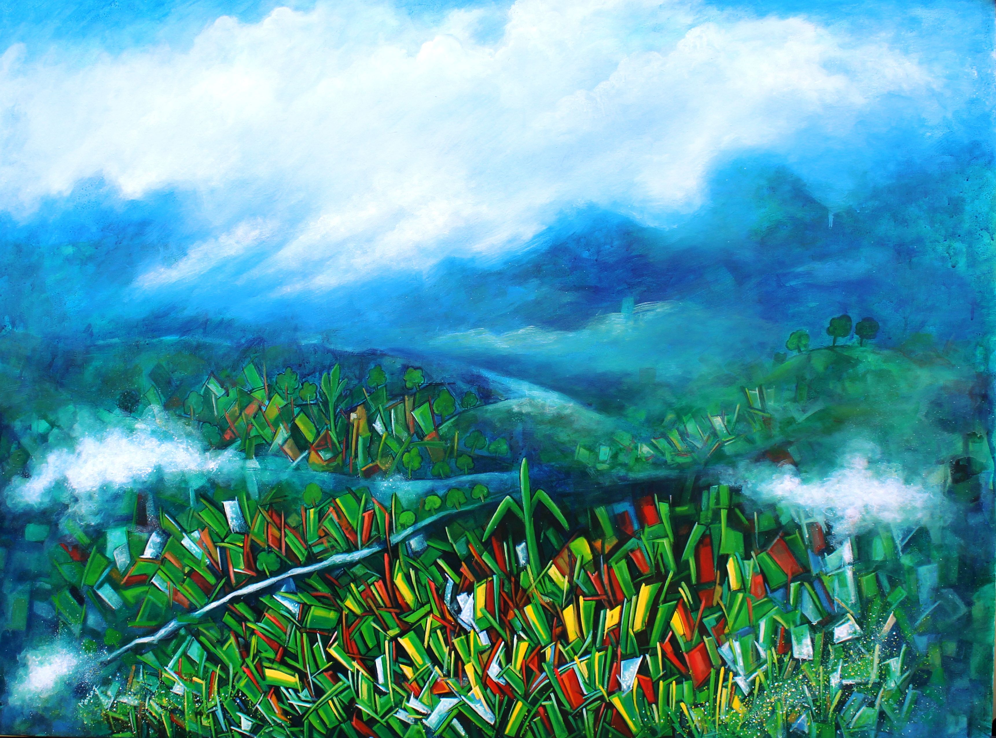 This painting is inspired by my travel memories inthe mountains,where distant home appears as a small patches of colour,scattered every where within the vast landscape.The vibrant foreground reflects the energy of the land,while the soft blue hills and mist creat a sense of calm and distance.Through this work, i capture not just a place,but a fleeting memory of journey,nature and the quiet presence of life