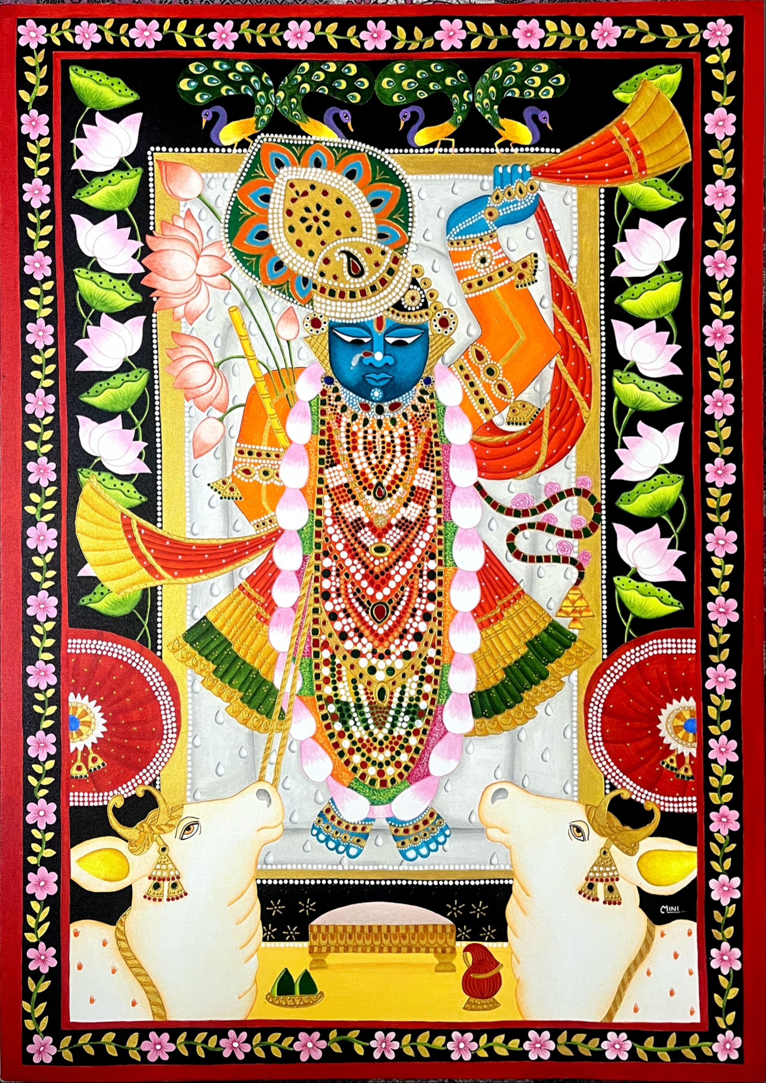 This artwork is a traditional Indian devotional painting depicting Shrinathji, a revered form of Lord Krishna, standing in his iconic Tribhangi posture. The composition reflects deep spiritual symbolism, rich folk-art aesthetics, and intricate craftsmanship.