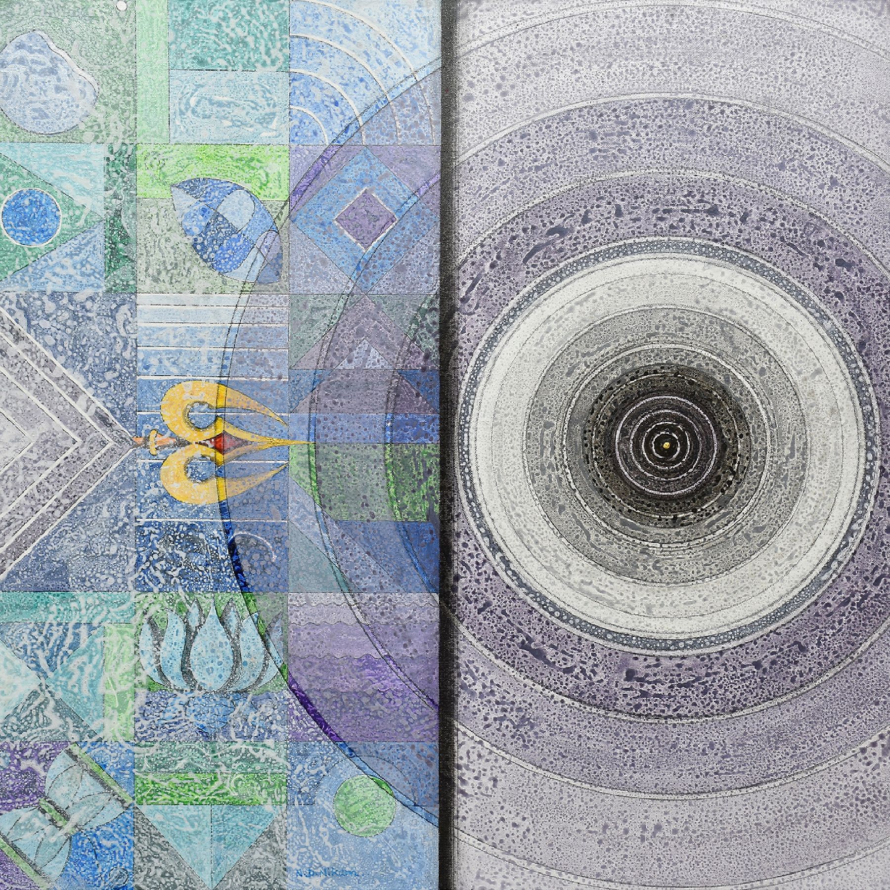 Nilesh Nikam's meditative paintings evoke a feeling of tranquillity in the viewer. Mystical motifs,textural play,layered application and Indian traditional motifs are complemented by a vibrant colour palette.Each canvas is bifurcated spatially andcan be interpreted as a metaphor to one's spiritual aura vs. one's worldly aura.