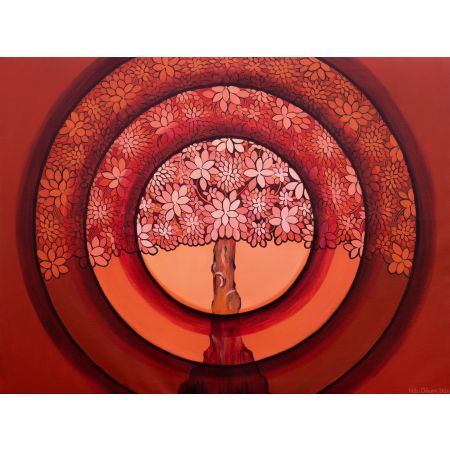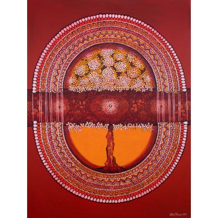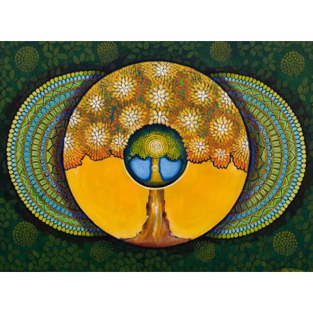 In this painting, the tree represents human consciousness. The tree's various colours symbolize distinct stages of evolution of consciousness. At each level we experience numerous ups and down, and by embracing them with love and compassion, we eventually become one with the light.