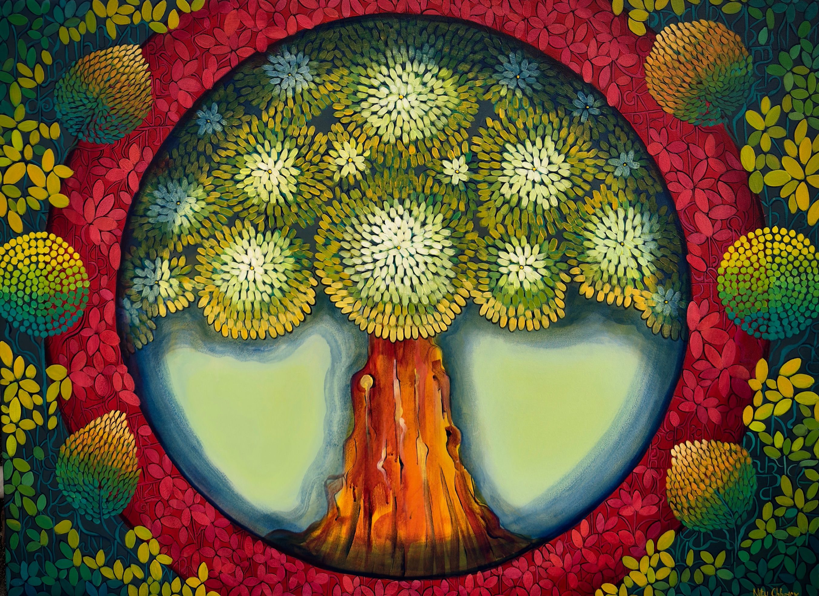 Kalp-Vriksh is a symbol of abundance, hope, and divine fulfilment. This artwork celebrates the blossiming of the wishes and the nurturing energy of Universe.