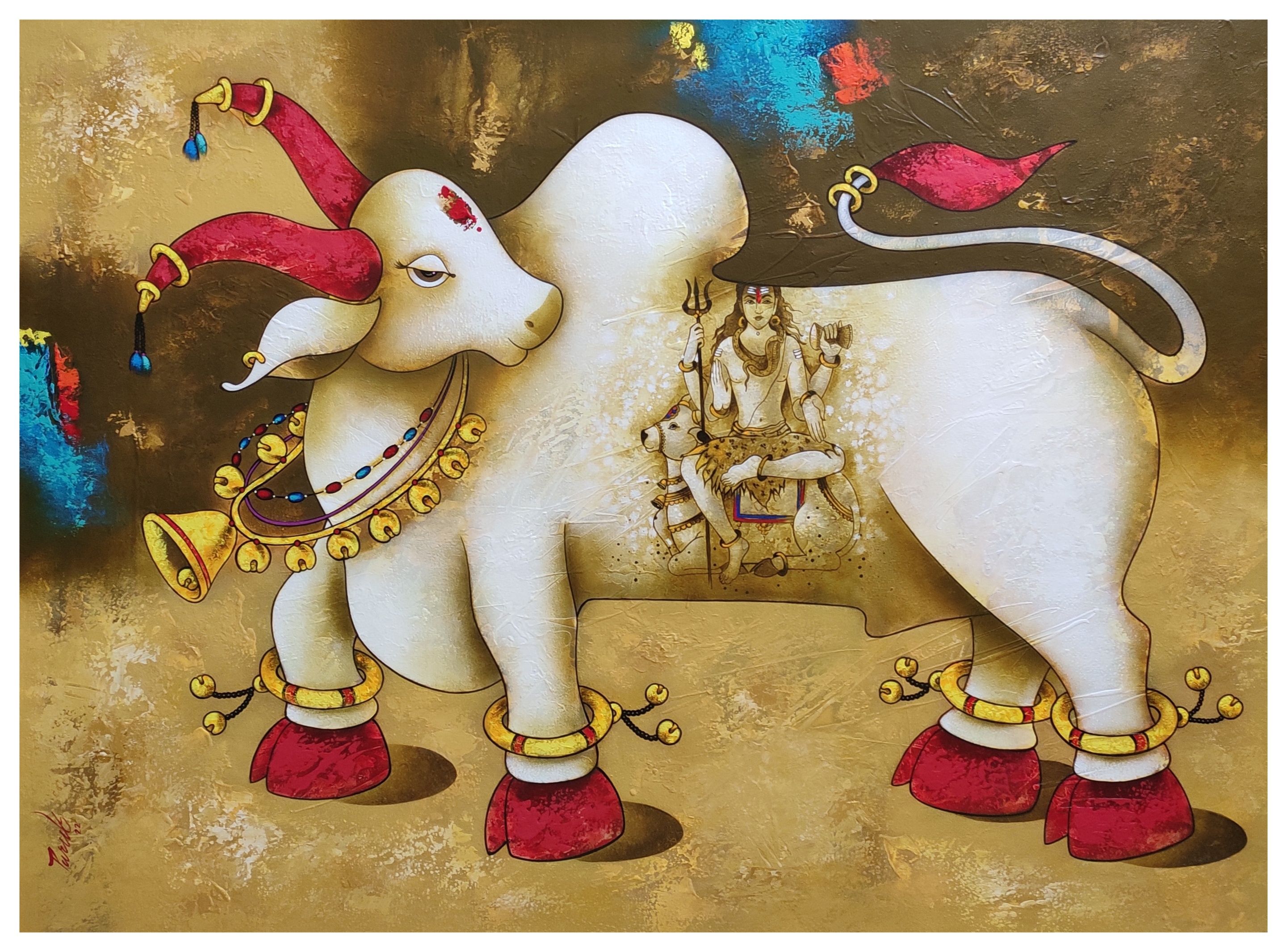 This painting depicts Nandi, the sacred bull, adorned with vibrant jewelry and intricate decorations. Inside Nandi, Lord Shiva is shown in a meditative pose, holding his trident and damaru, symbolizing their spiritual connection. The earthy tones with splashes of red and blue create a divine atmosphere. Shiva's calm presence represents cosmic balance, while Nandi serves as his devoted protector. The fusion of tradition and modern art is reflected in the detailed textures and abstract background.