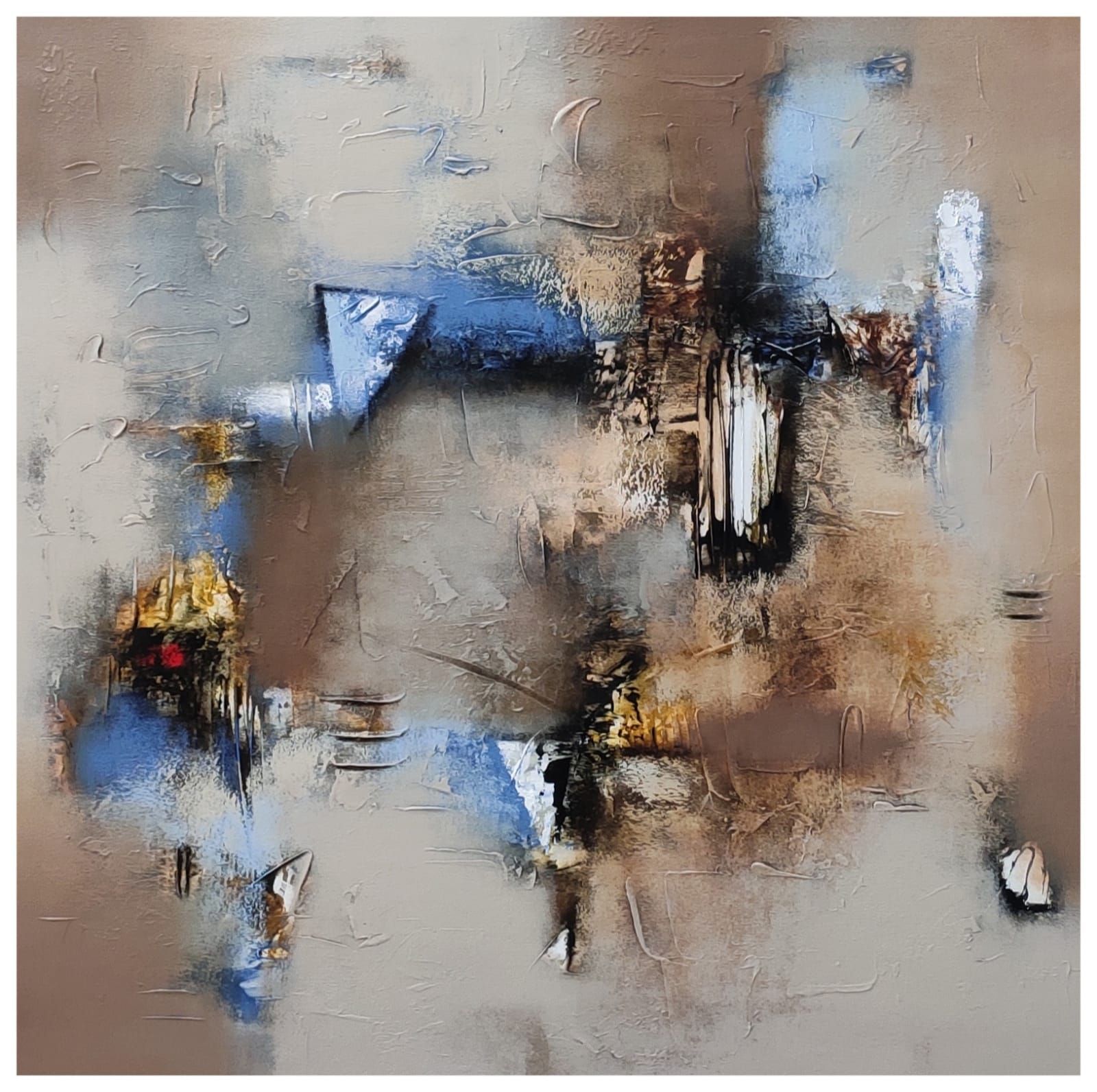 This abstract painting features a harmonious blend of earthy tones and soft blues, creating a textured composition with depth and movement. The interplay of light and shadow, along with subtle metallic accents and dynamic brushstrokes, evokes a sense of mystery and fluidity. Geometric hints and organic shapes coexist, offering an engaging visual balance that invites personal interpretation.