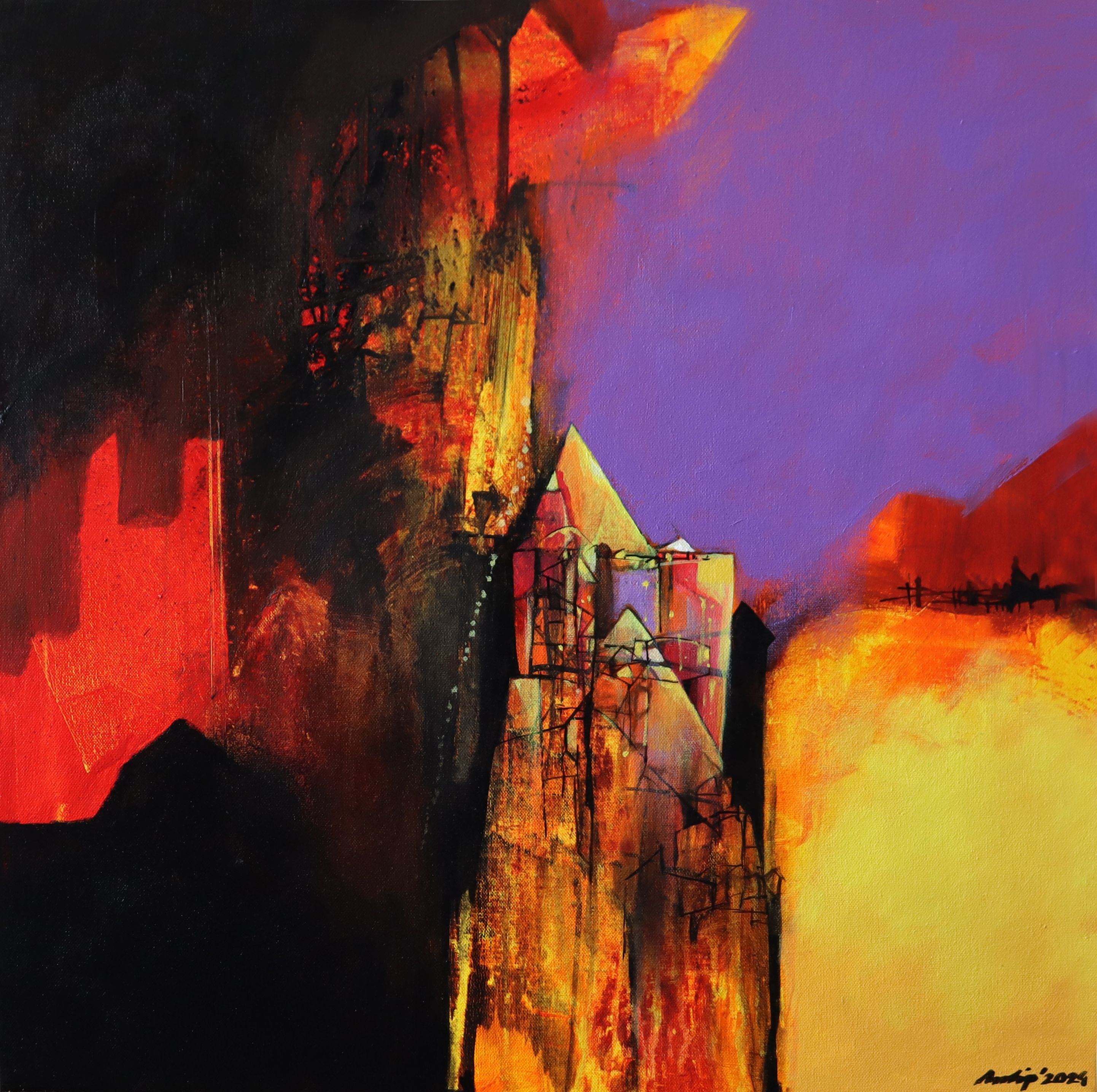This painting presents a dramatic, emotionally charged cityscape that rises from darkness into light. Towering architectural forms dominate the composition, their sharp, angular silhouettes suggesting buildings, fortresses, or inner structures shaped by time and experience. The city appears both constructed and eroded, as if memory and history are embedded within its walls.