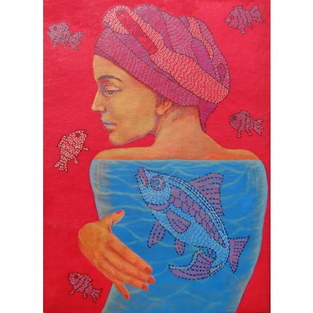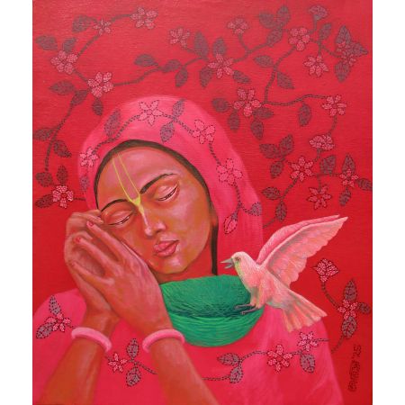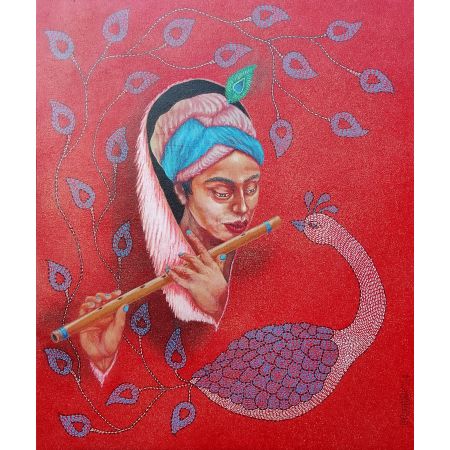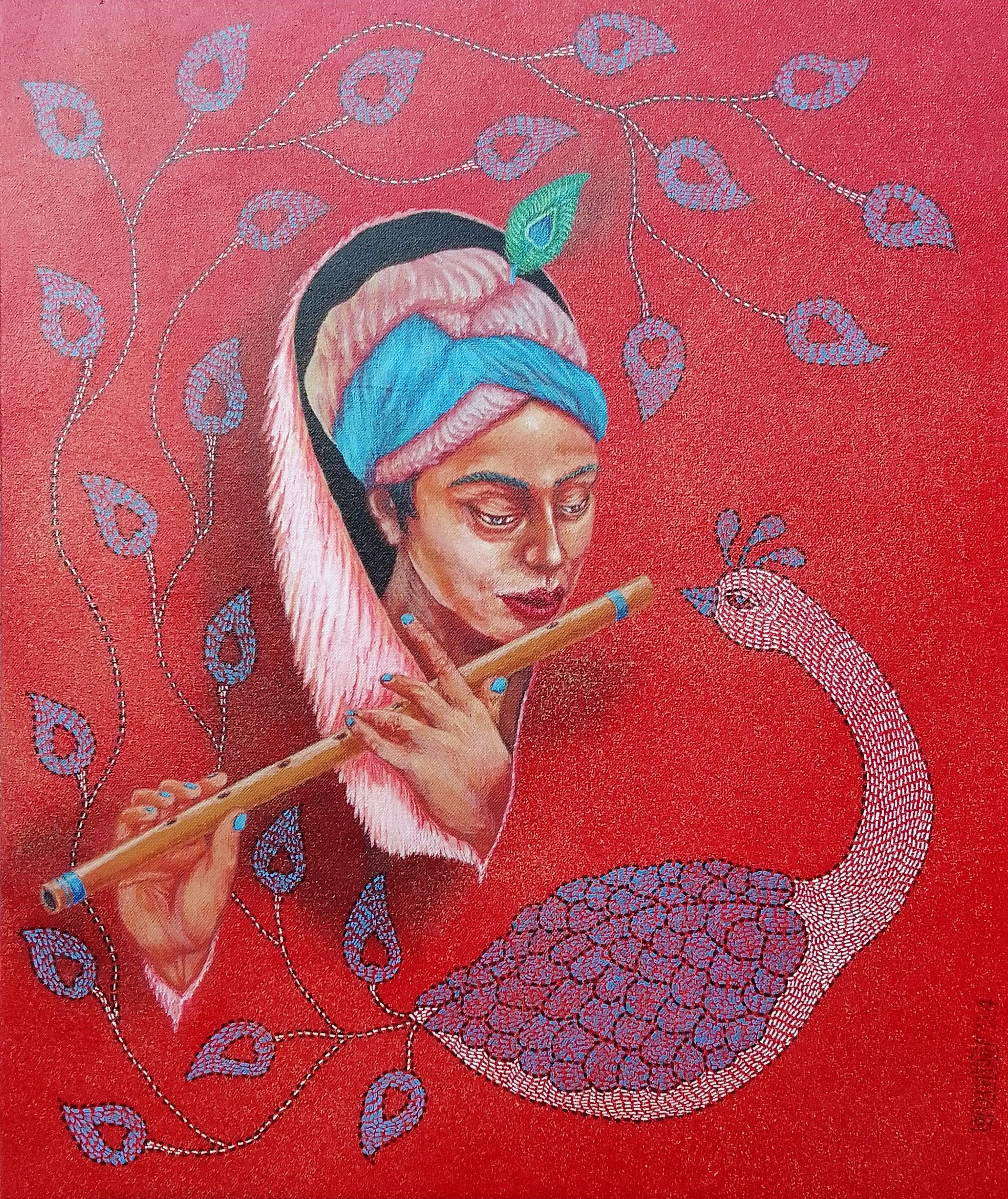 Set against a striking red background, this surreal portrait captures a musician lost in contemplation, playing a wooden flute. The subject wears a vibrant headdress adorned with a delicate peacock feather, harmonizing with the intricate peacock motifs that flow through the composition. A mesmerizing blend of blue and pink hues weaves through the ornate patterns, resembling embroidered artistry. The peacock's majestic tail unfurls in decorative teardrop motifs, enhancing the dreamlike atmosphere. Richly textured layers and symbolic cultural elements infuse the piece with a feminine mystique, merging Indian-inspired artistry with an ethereal, contemporary vision.