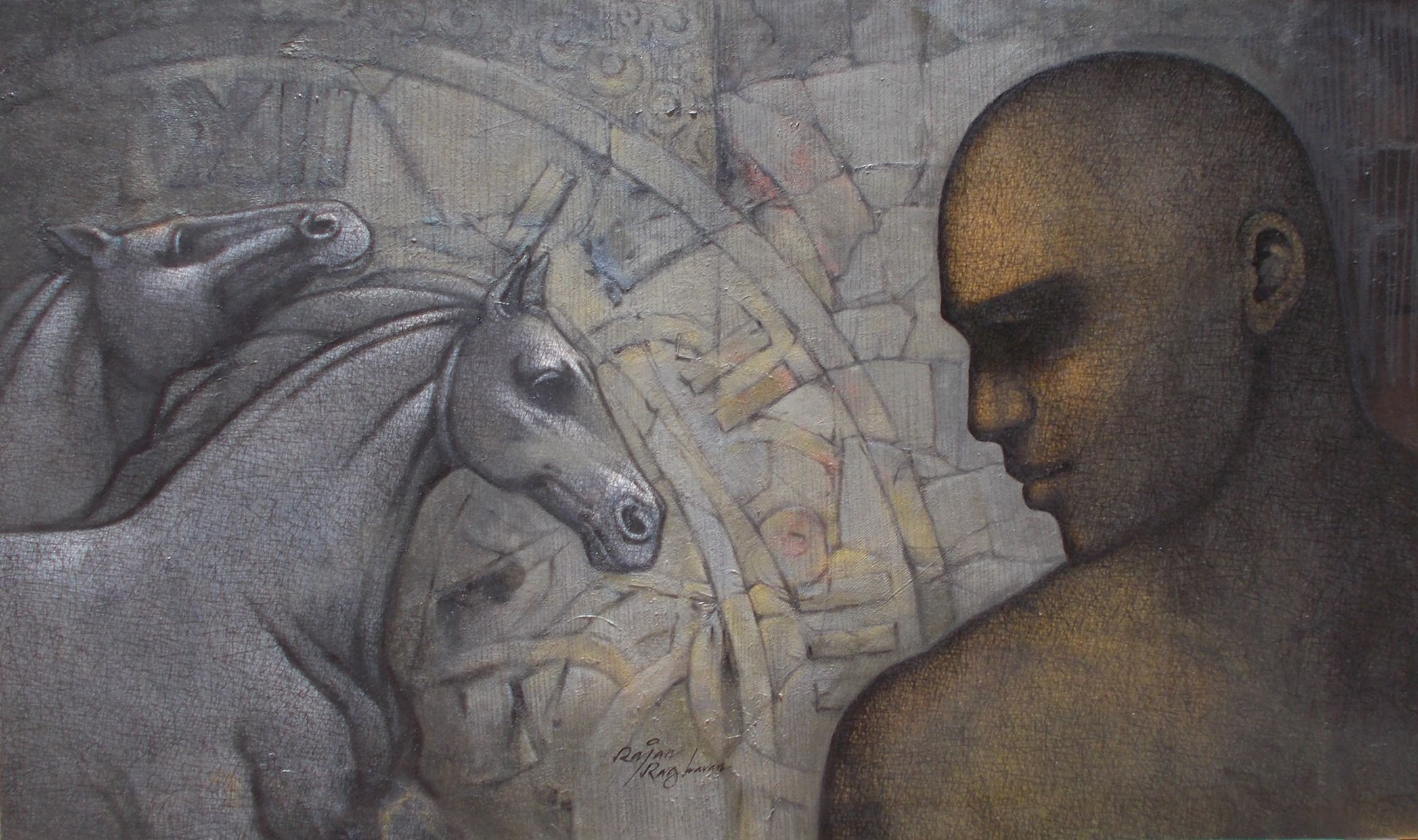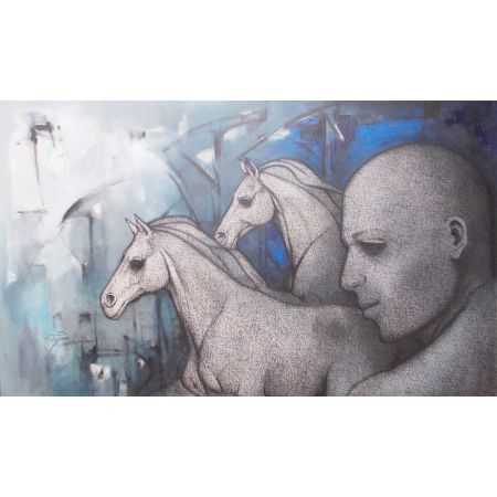 My painting's title is FORCE - 67 set against the roman clock, this work reflects the quiet resilience shared between man and horse. Time moves foward, yet their bond remains still a meditation on royalty, endurance, and the unspoken strength that defies the ticking world around them