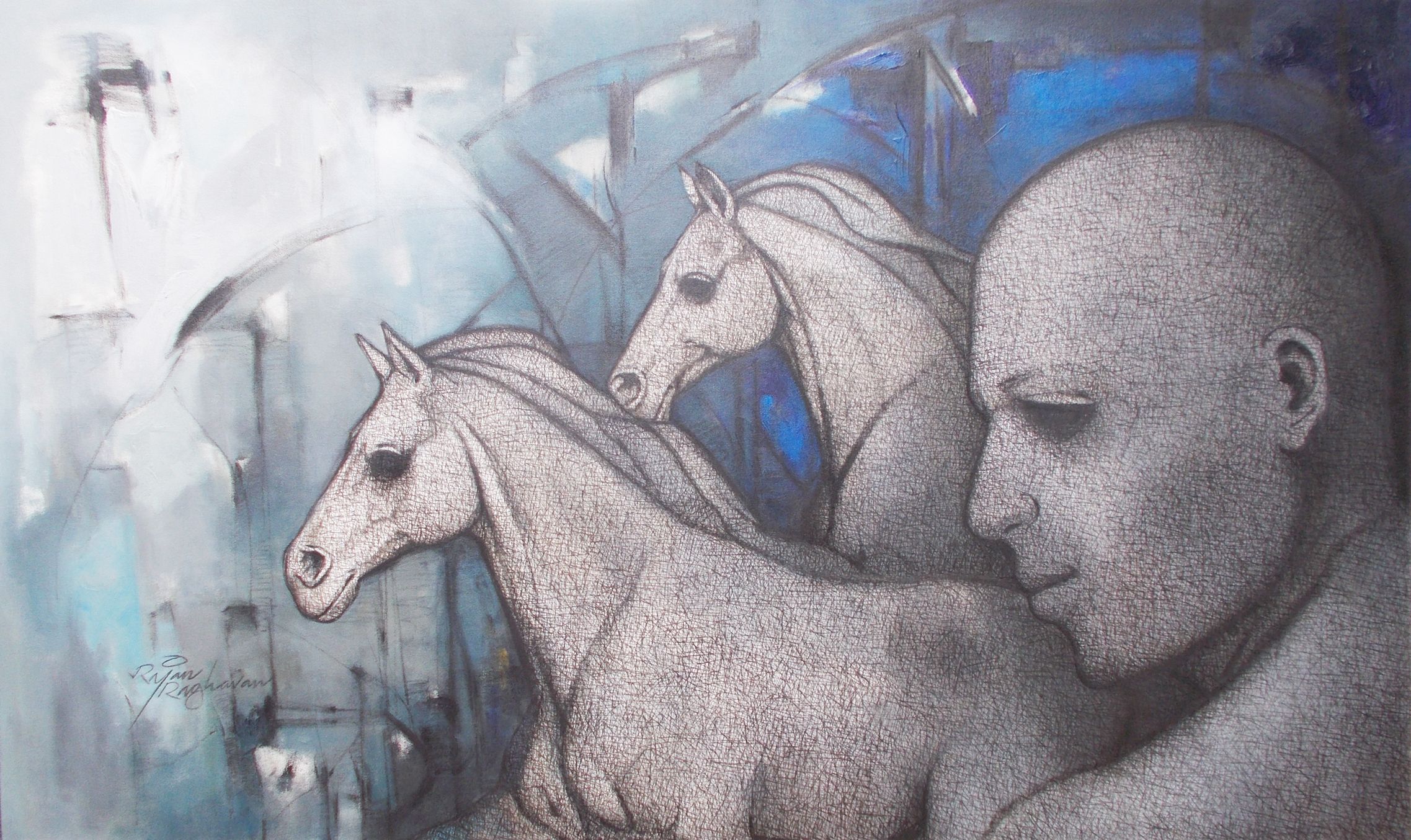My paintings title is FORCE - 68 in my painting of a human and horses i aim to convay the deep emotions associated with the inner strength that resides within each person. The interplay between the man and the horses symbolizes the connection between humanity and nature Ussing narrow brush shlines and a monochrom color palette, I create a delicate yet dynamic texture that emphasize movment and energy.