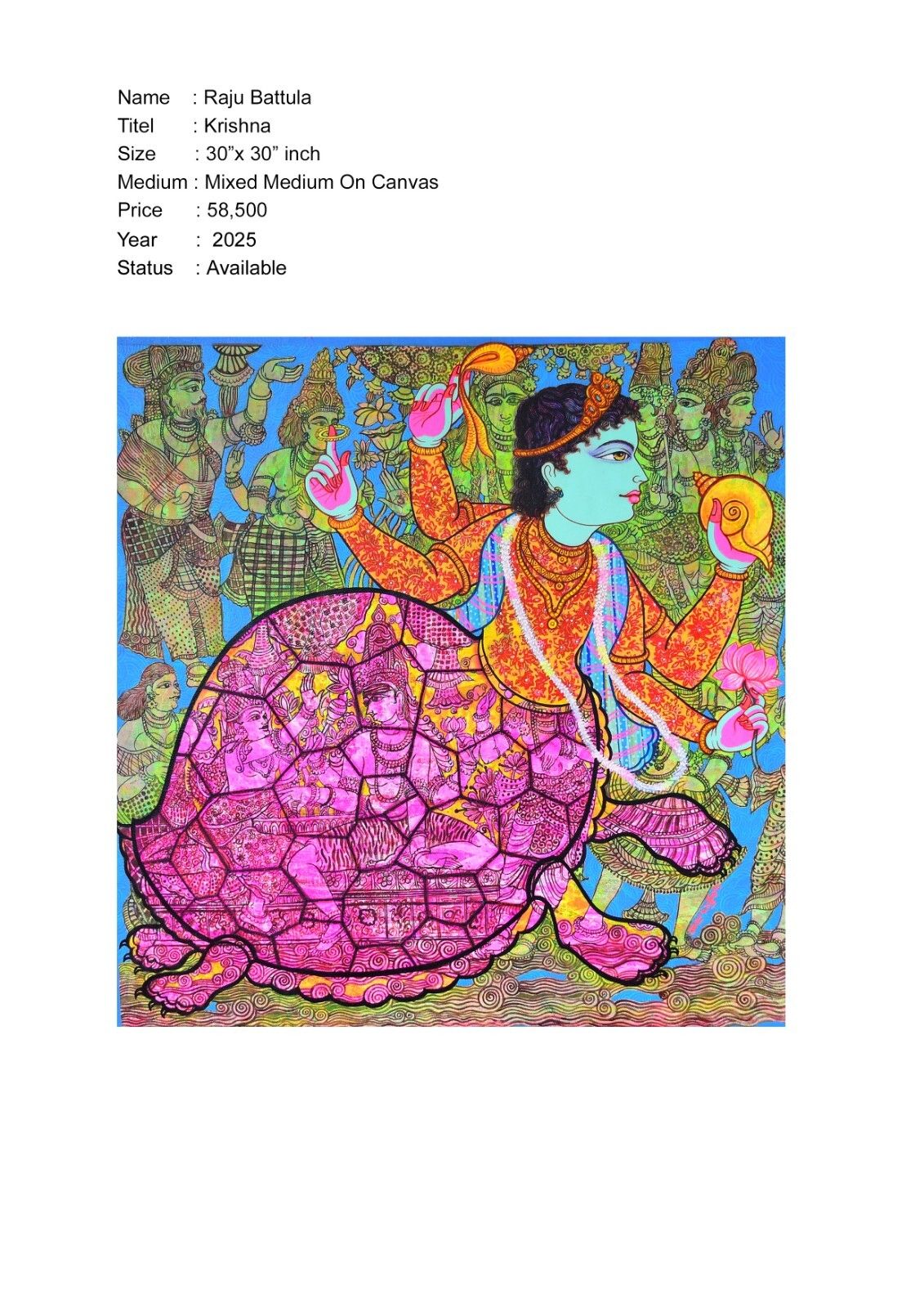 This artwork “Krishna” (2025) by Raju Battula, is a contemplative and symbolically rich composition. Executed in mixed media on canvas, it portrays a spiritual dialogue between Krishna and the cow—an emblem of devotion, nature, and nurturing grace. Through vibrant colours, intricate motifs, and mythological imagery, the artist weaves a delicate harmony between the divine and the human. The painting stands as a profound confluence of Indian folk spirituality and contemporary aesthetics.
